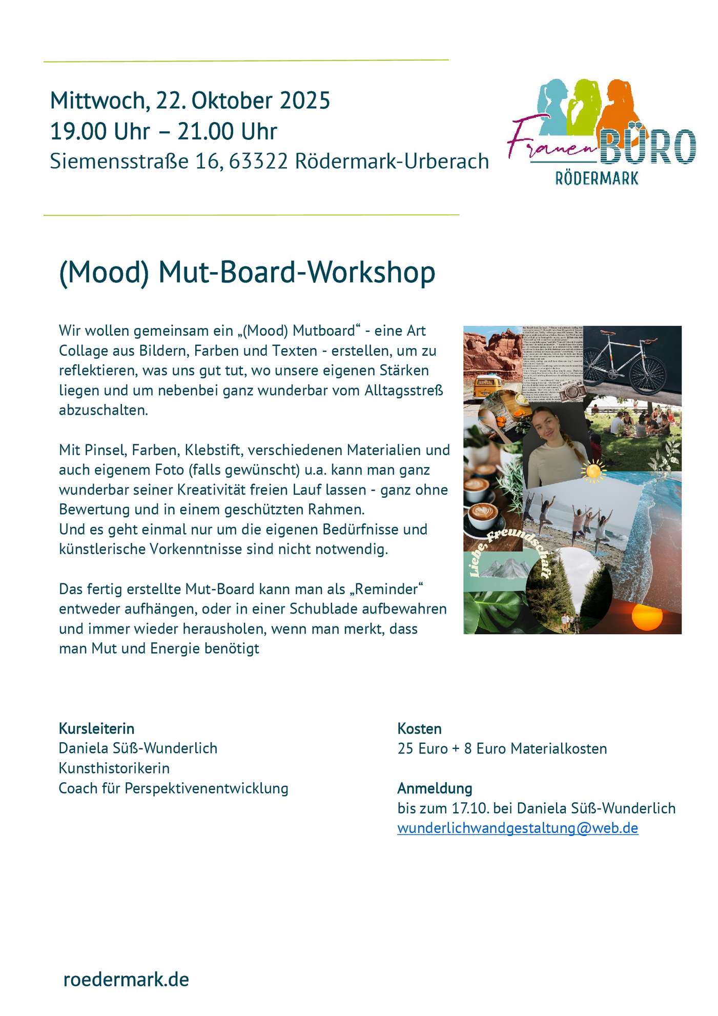 Auch ein „(Mood) Mut-Board-Workshop“ gehört zum Programm. Was es damit auf sich hat, erläutert Daniela Süß-Wunderlich am 22. Oktober. Über das Thema „Fastenkuren“ informiert Tanja Behre am 8. Dezember im Bürgertreff Waldacker – als Auftakt zu einer Fastenwoche, die sich dann im Januar anschließt: gemeinsames Fasten nach Buchinger mit einer Einführungsveranstaltung und täglichen Treffs ab dem 23. Januar. Mit Vorträgen sind Anita Poschmann vom VdK Urberach und Bernd Koop vom VdK Ober-Roden beteiligt.