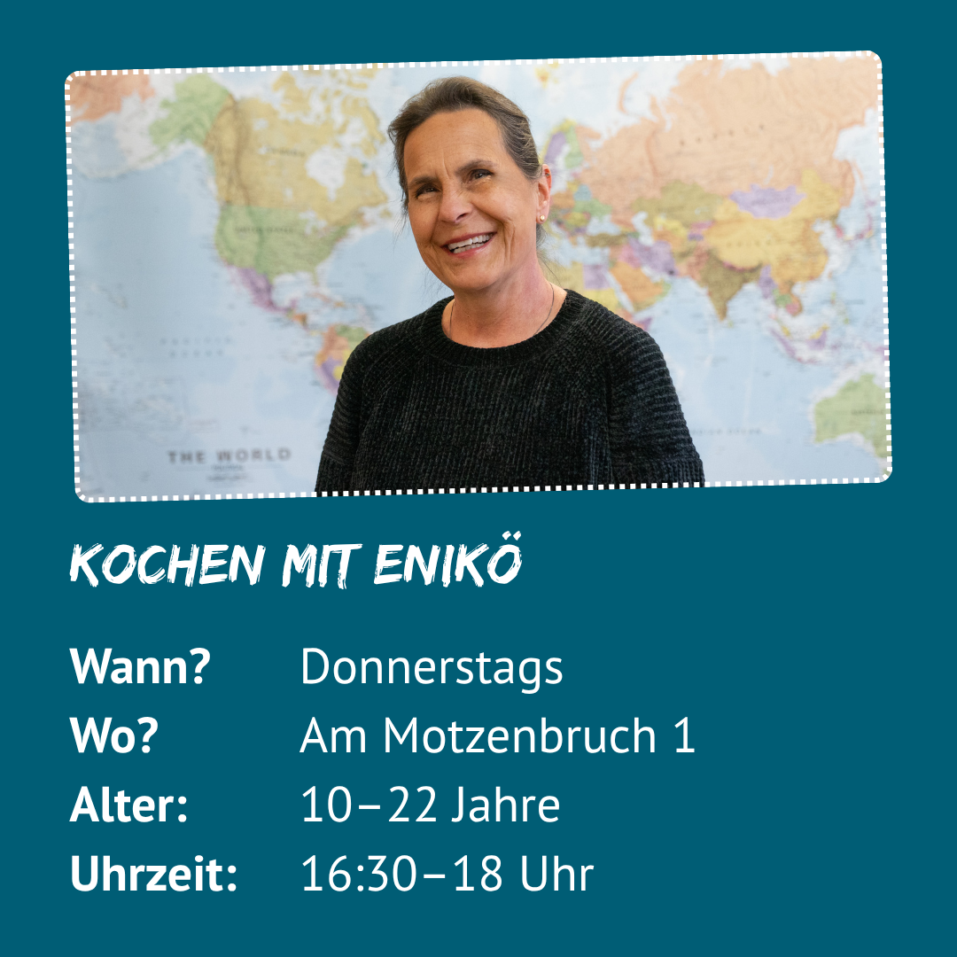 Unter Anleitung unserer erfahrenen Köchin Enikö werden hier jeden Donnerstag leckere Mahlzeiten gezaubert, welche sowohl bei den kochenden, als auch bei den essenden Jugendlichen immer super ankommen. Jede Woche lockt ein anderes Rezept, der Kreativität sind dabei keine Grenzen gesetzt.