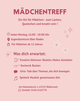 Der Mädchentreff startet! Jeden Montag von 16:00- 18:00 Uhr treffen wir uns im Jugendzentrum Ober-Roden. Ein Ort nur für euch - zum Lachen, Kreativ sein und Wohlfühlen.