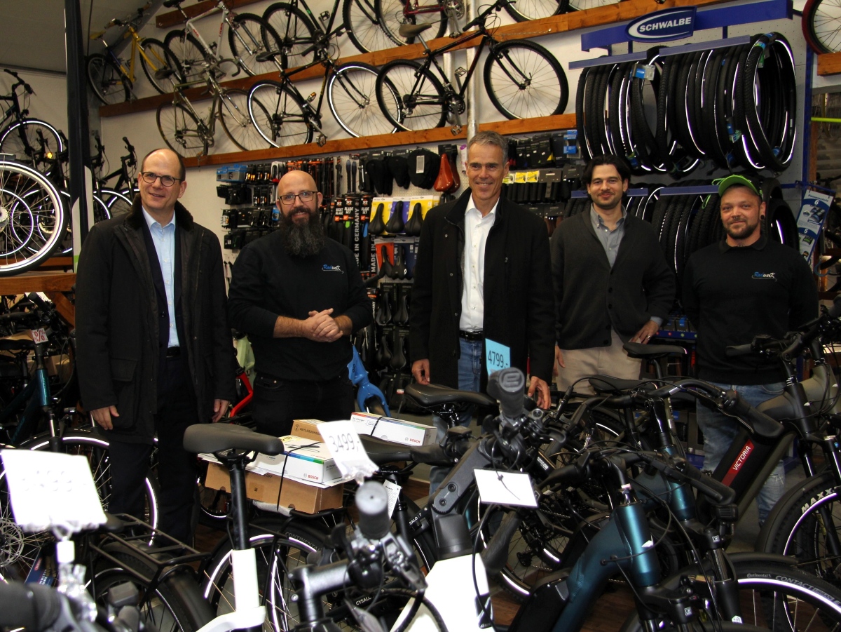 Foto 5: Offiziell eröffnet wurde die diesjährige „Nacht der Ausbildung“ im Rödermärker Fachgeschäft „Radwerk“. Dort begrüßten die Velo-Spezialisten Tom Nau (rechts) und Daniel Rebmann (Zweiter von links) den Leiter der städtischen Wirtschaftsförderung, Till Andrießen (links), sowie IHK-Hauptgeschäftsführer Markus Weinbrenner (Mitte) und dessen Kollegen Julian Daheim.