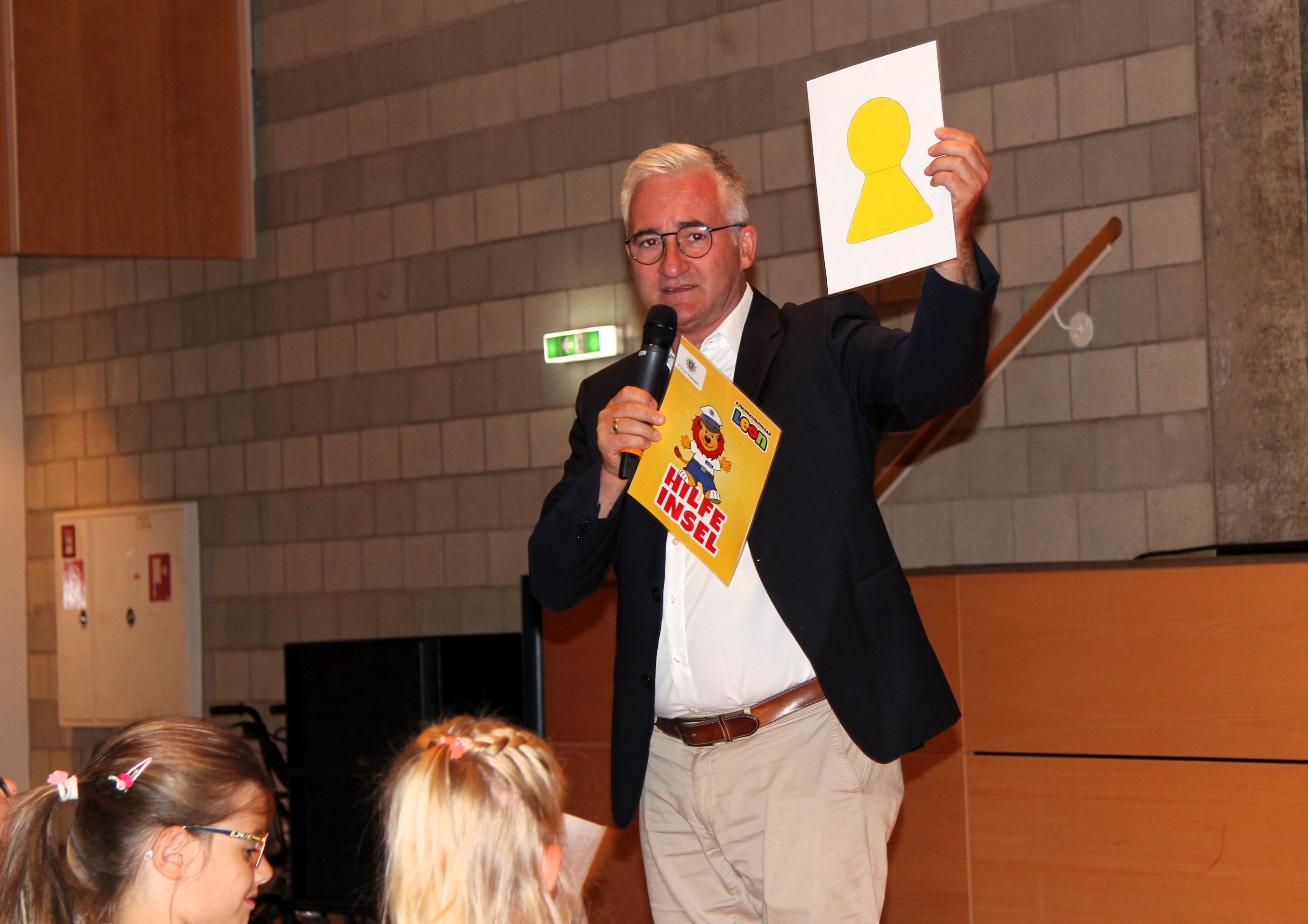 Bürgermeister Jörg Rotter gesellte sich hinzu. Er übermittelte gute Wünsche für den neuen Lebensabschnitt im Namen der Stadt und appellierte an die Erziehungsberechtigten, auf das Elterntaxi nach Möglichkeit zu verzichten. Zur Schule laufen, sich mit Gleichaltrigen orientieren, Wege und feste Regeln einüben: Das sei der richtige Ansatz, betonte Rotter. Auch auf Dinge, die insbesondere den Schulanfängern den Alltag erleichtern sollen, machte er aufmerksam: Auf die „kleinen Rödermärker“, gelbe Markierungen an zentralen Kreuzungen und Übergängen, und auf das Logo der Leon-Hilfe-Inseln, ein Wegweiser zu Zufluchtsorten, wenn sich Kinder unsicher fühlen.