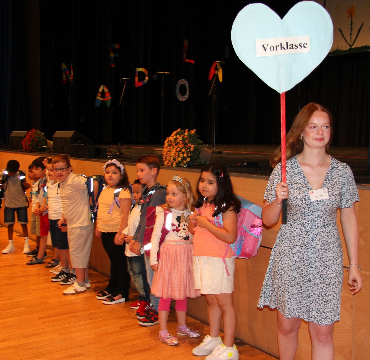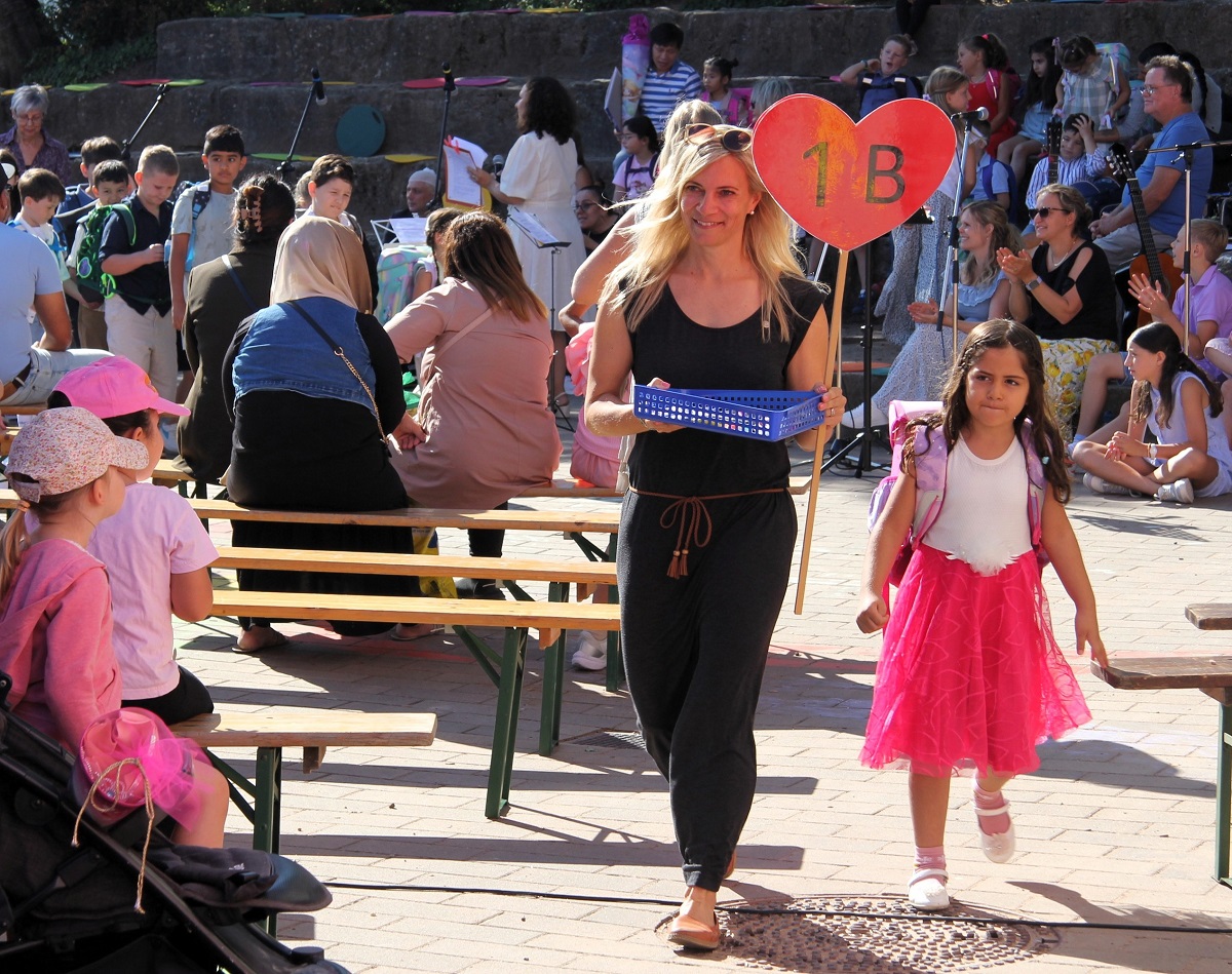 Schulleiter Stefan Wesselmann moderierte das Begrüßungsprogramm, das analog zum Fest in Urberach mit Chorgesang, aufmunternden Worten und herzlicher Atmosphäre punkten konnte. Auch sinnbildlich, denn die Pappschildchen in Herzform, hinter denen sich die Klassen nach der obligatorischen Namensverlesung aufstellen, gehören zum Kanon der Traditionen. So ist es Brauch: Alle Jahre wieder, wenn die Einschulung ein neues Kapitel im Buch der Jung-Rödermärker aufschlägt.