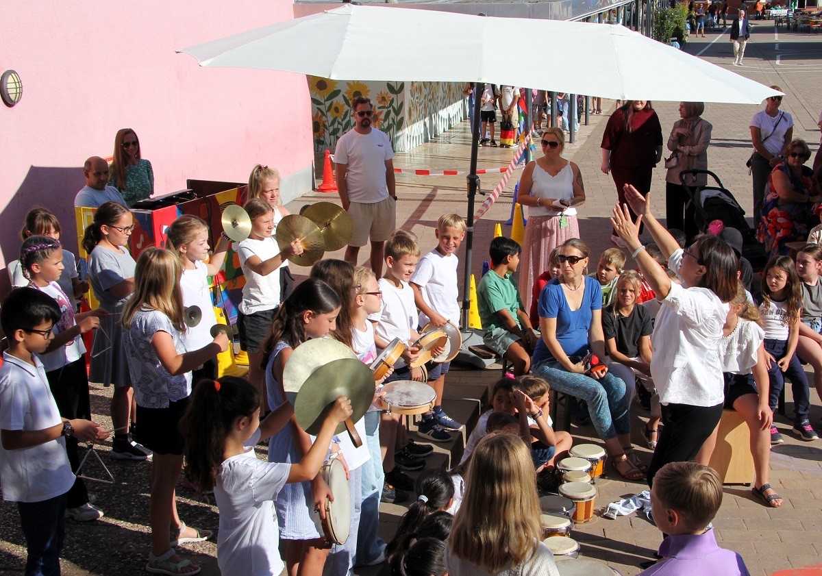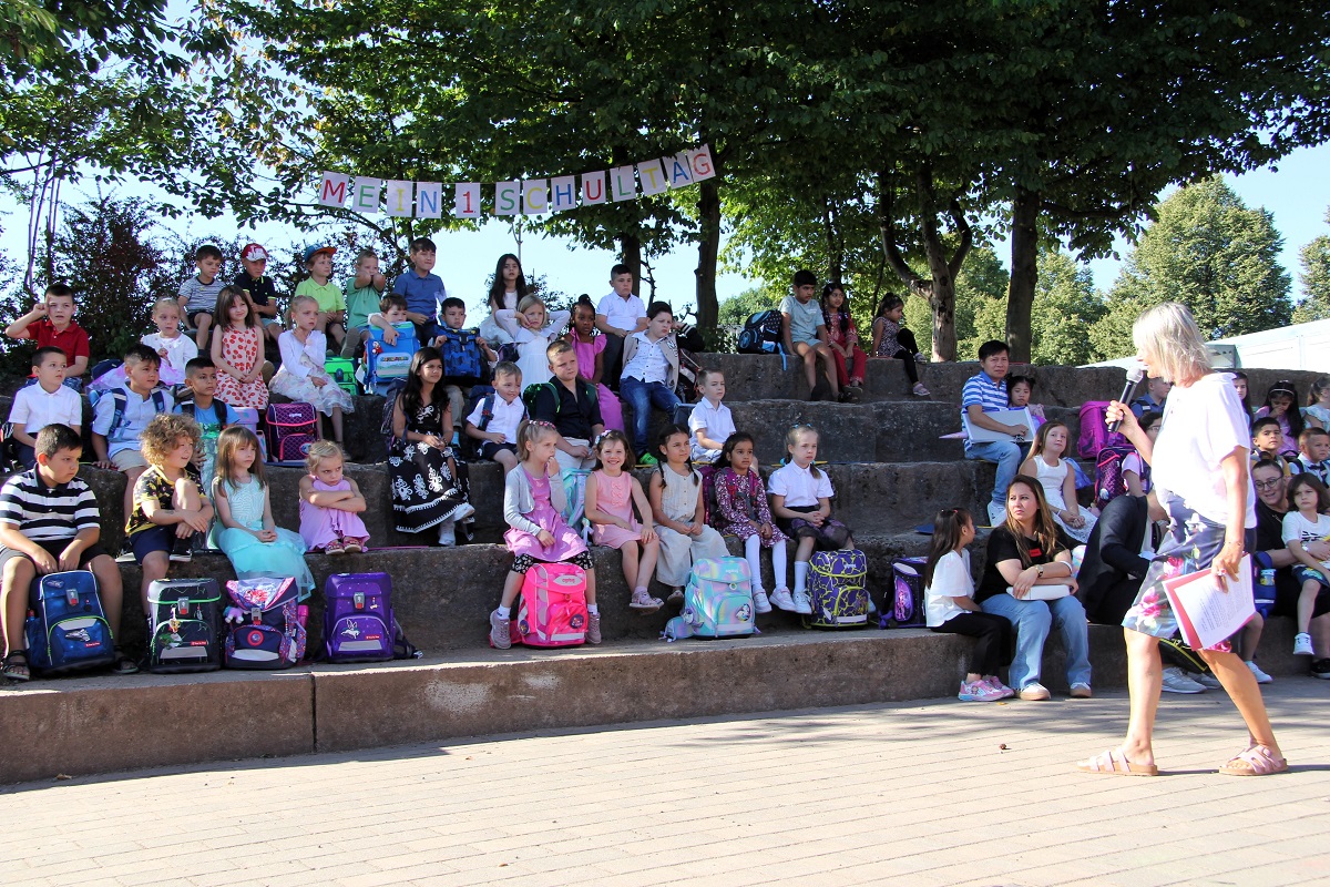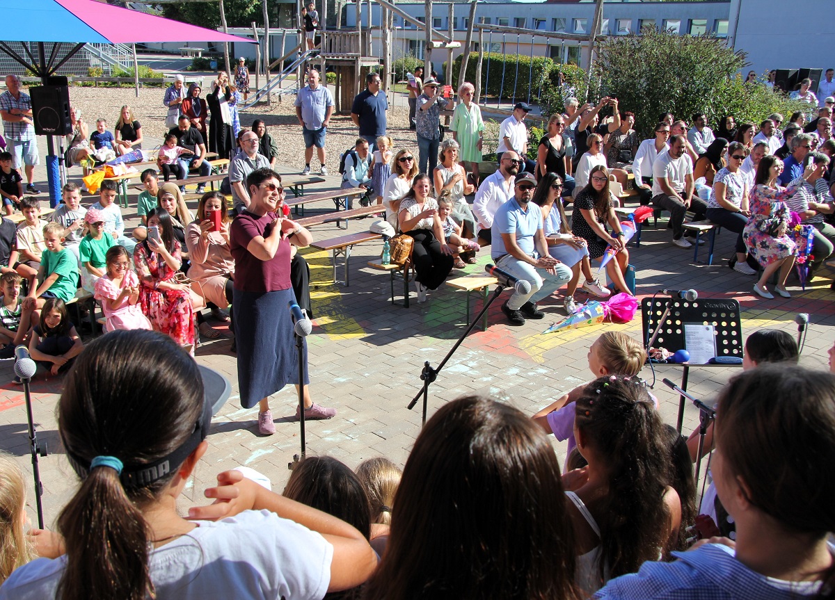 Getreu dieser Devise konnten Andrea Schöps, die Leiterin der Schule an den Linden, und ihr Kollegium insgesamt 124 Kinder zur ersten Unterrichtsstunde führen. Fünf 1. Klassen und eine Vorklasse bilden in Urberach den Starter-Jahrgang 25/26. Die Bedingungen beim großen Hallo im Tribünenbereich auf dem Pausenhof hätten nicht besser sein können. Mütter, Väter und Schultütenträger in freudiger Erwartungshaltung, strahlender Sonnenschein, mehrere schwungvolle Musikbeiträge, dazu sogar eine kleine Theatereinlage, präsentiert von den älteren Mitschülern – und eine Rektorin, die ob des Wissens, das sich die ehemaligen Kitakinder rund um Zahlen und Buchstaben beim Frage-und-Antwort-Spiel entlocken ließen, anerkennend applaudierte, frei nach dem Motto: „Ihr bringt schon eine Menge mit!“