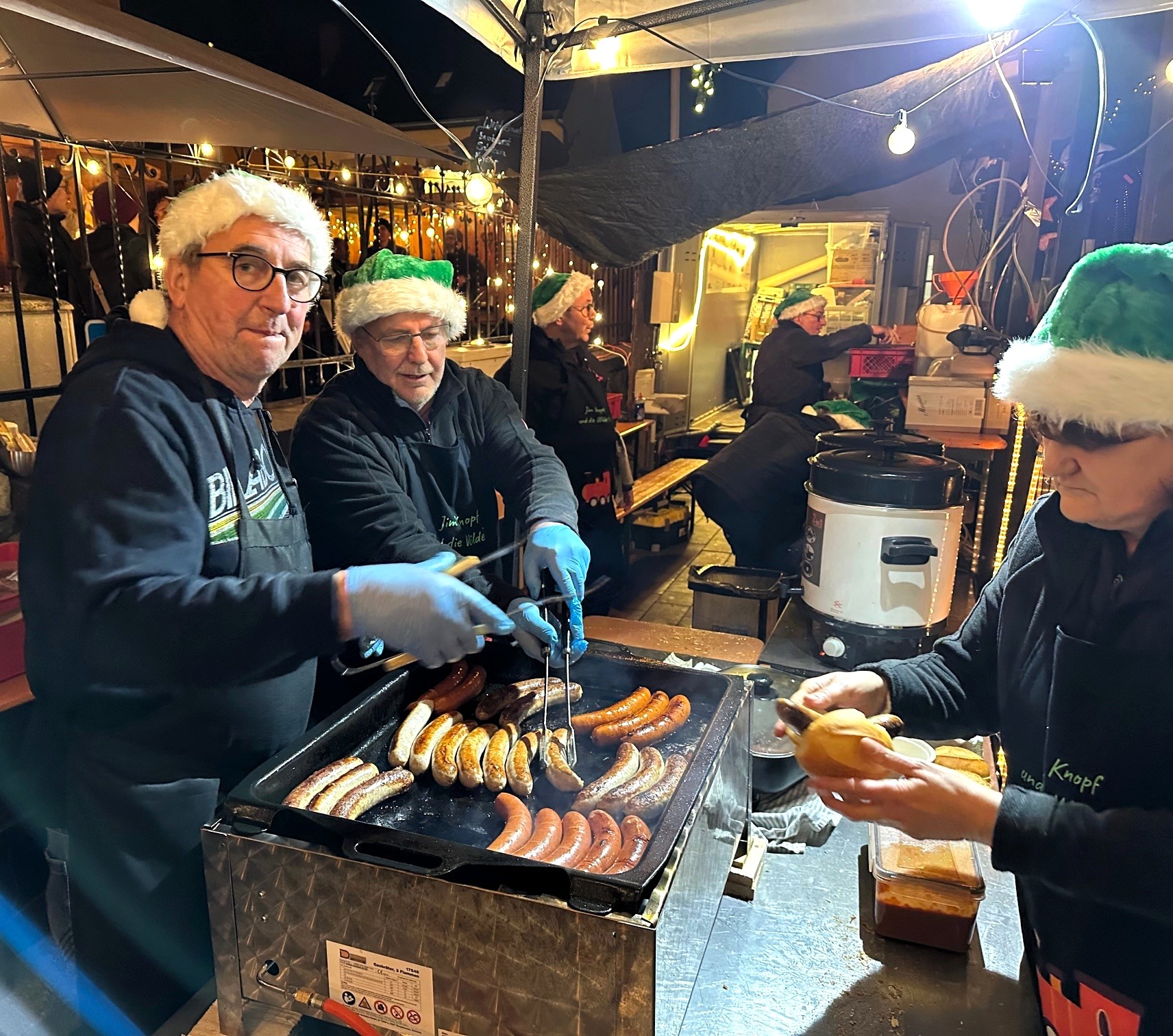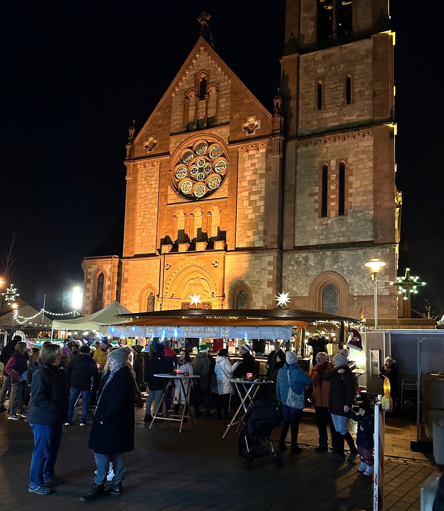 Nach der Einweihung herrschte Betrieb auf der kleinen Bummelzone zwischen dem Kirchplatz und dem Dinjerhof an der Pfarrgasse, wo der dortige Freundeskreis die organisatorischen Fäden zog. Mit den beiden Fixpunkten als Podium für Ausschank, Bewirtung (sehr vereinsverbunden: am Stand der TG Ober-Roden wurde mit grün-weißen Mützen gezapft und gegrillt), musikalischen Programmpunkten sowie dekorativer Vielfalt an den Ständen und im Forum St. Nazarius, wo auch in diesem Jahr der Kreativmarkt der Kolpingsfamilie seinen Platz hatte: So konnte der Adventsmarkt 2025 beim Publikum punkten.