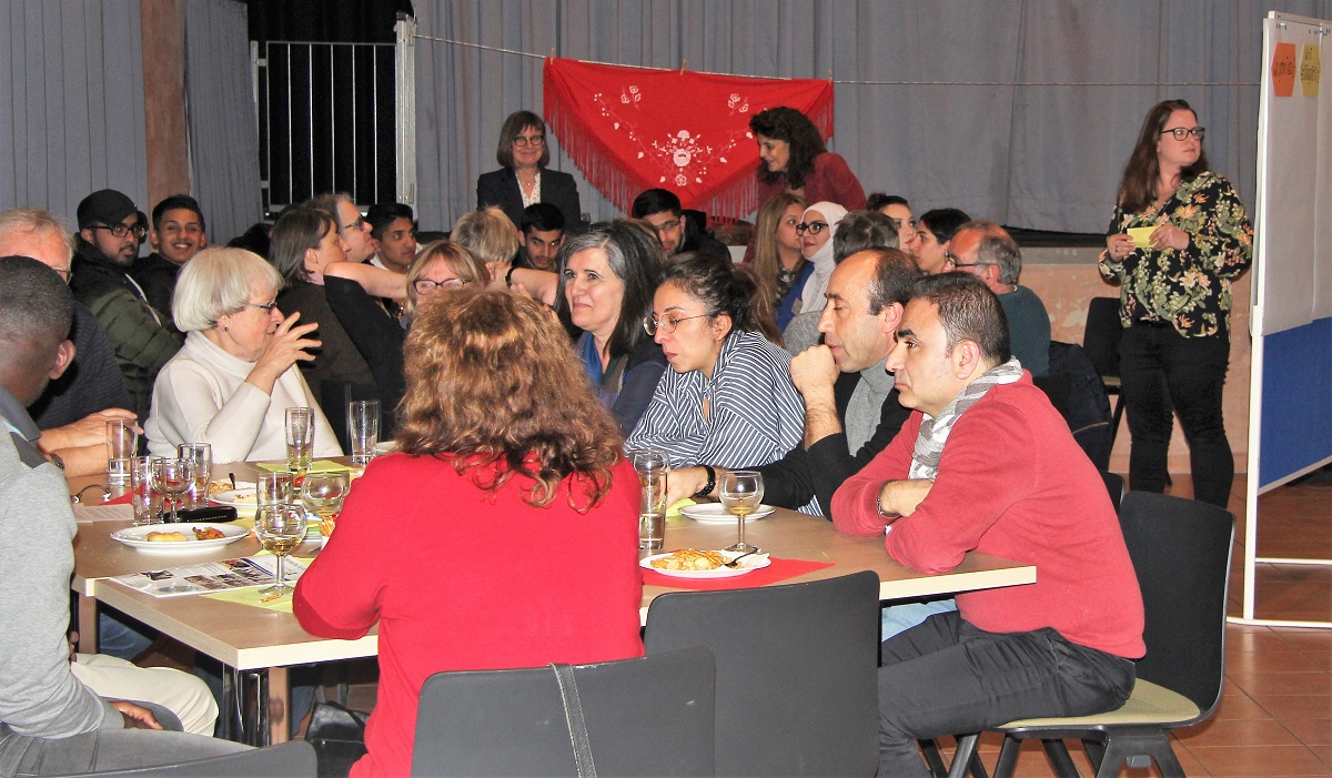 Moderiert wurde der Abend von Paola Fabbri-Lipsch, Referentin für interkulturelle Bildung im Zentrum Ökumene der Evangelischen Kirche und ehemalige Leiterin des Integrationsbüros der Stadt Neu-Isenburg, die auch den gesamten Prozess begleiten wird. Sie stellte nach den einleitenden Informationen und Referaten die vier Themenfelder vor, die die Arbeit an diesem Abend strukturierten: „Wohn- und Lebensräume“, „Begegnungs- und Kulturräume“, „Lernräume“ und „Arbeitsräume“. Je nach Interesse teilten sich die Teilnehmer auf. Es wurde rege miteinander diskutiert, analysiert und es wurden schon erste Ideen entwickelt. Zwischendurch war Zeit, die Spezialitäten aus Pakistan, der Türkei, dem Iran und aus Deutschland zu genießen. Das Büfett hatten der Verein „Alle für Alle“, die Ahmadiyya-Gemeinde und das SchillerHaus-Team bestückt.