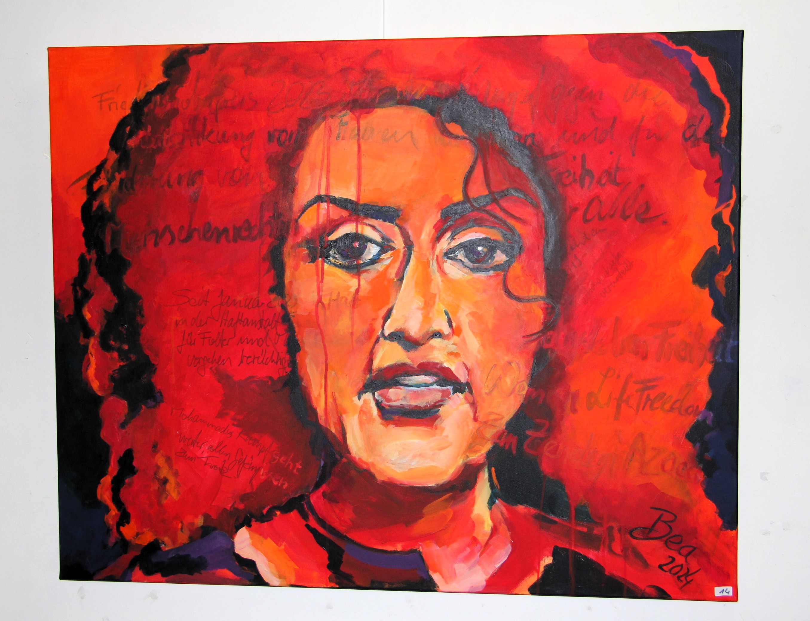 Gestik und Mimik als Spiegel der Seele, Posen und Falten als Ausdruck innerer Befindlichkeiten, als Zeichen der Stärke und Schwäche: „Wir zwei ergänzen uns sehr gut mit den Exponaten, die hier gezeigt werden“, erklärte Wamser, frei nach dem Motto: Es menschelt im Bücherturm. Frauenköpfe dominieren. Ein Paradebeispiel: Das rot-orange leuchtende Portrait der iranischen Menschenrechtsaktivistin Narges Mohammadi. Anmut, Grazie, Charme und Behauptungswillen: All diese Dinge lässt auch Weber in ihren plastischen Darstellungen aufblitzen.