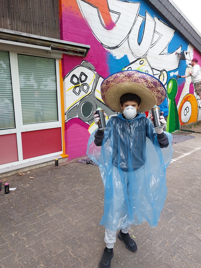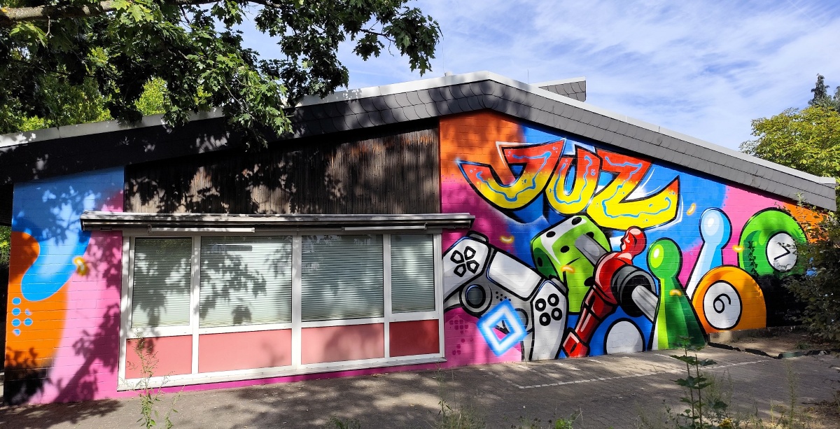 „Wir wollen die grauen und tristen Außenwände gerne bunt und fröhlich gestalten!“ Diesen Wunsch äußerten Jugendliche gleich nach der Eröffnung des neuen Jugendzentrums im ehemaligen Motzenbruch-Kindergarten zu Beginn des Jahres. Dass hier etwas getan werden muss, sah auch das Team so. Da aber das Sprayen in den Wintermonaten nicht so gut funktioniert, wurde für den Sommer ein Graffiti-Workshop geplant.