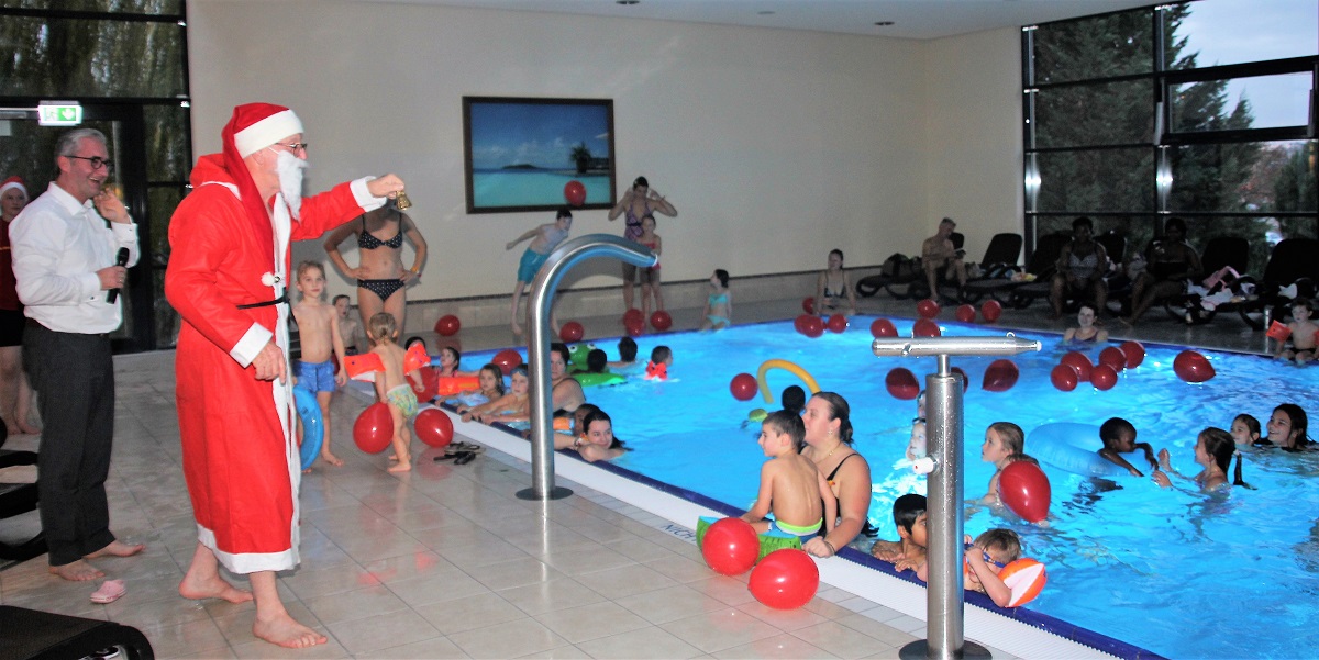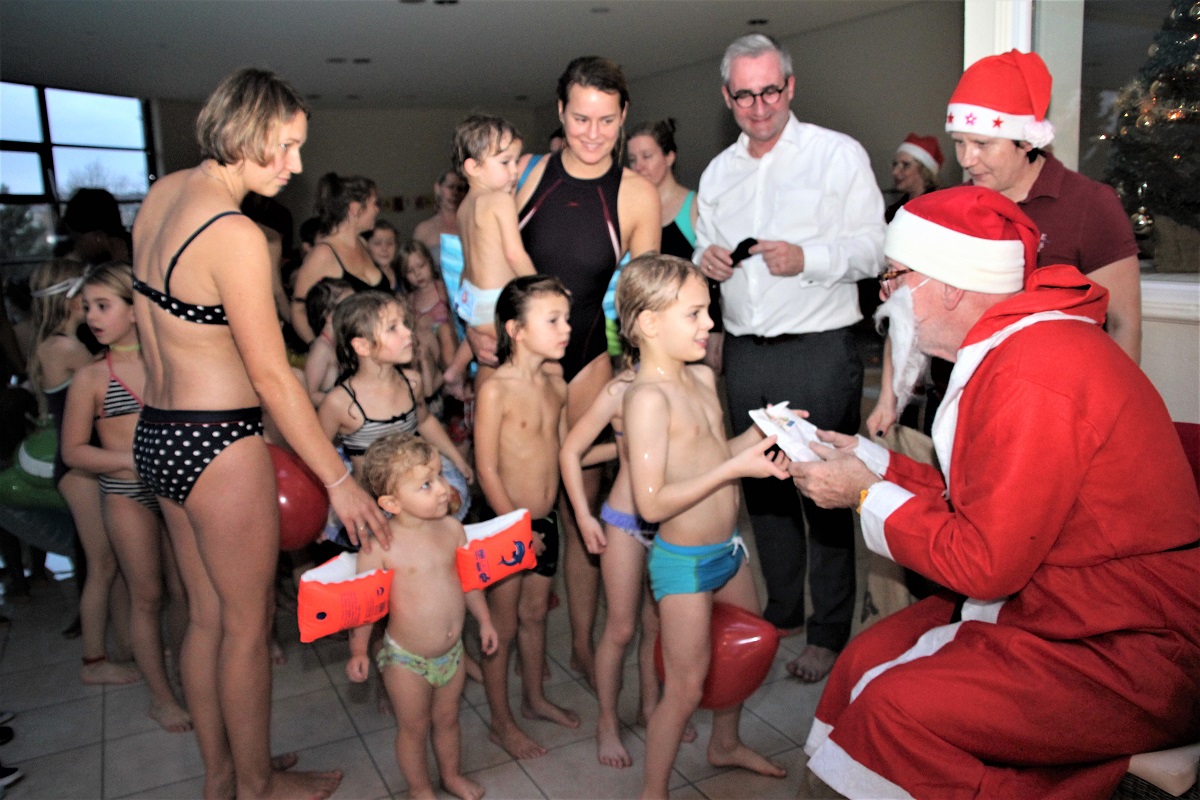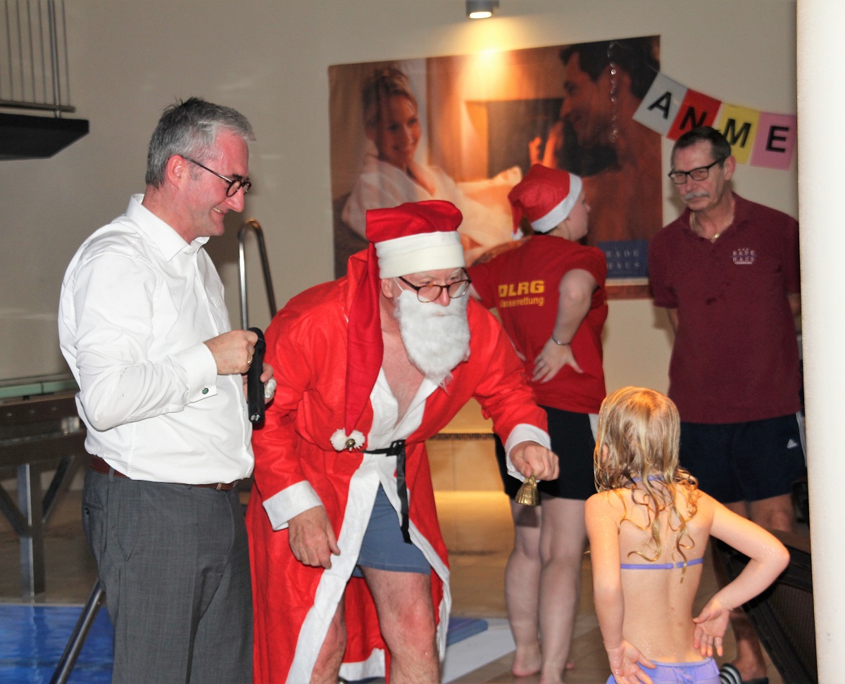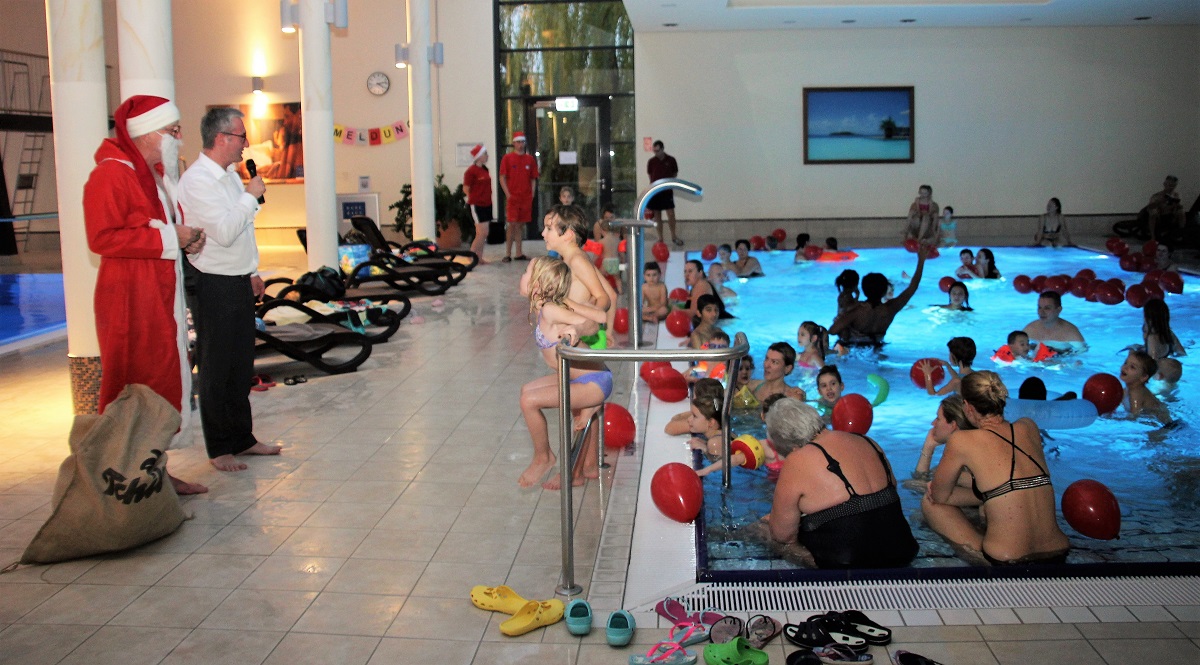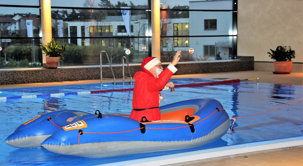 Die Kinder warteten schon ungeduldig, riefen ihn beim Namen, und dann kam er: Barfuß, Badehose unter dem roten Mantel, nicht mit seiner Rentierkutsche, sondern in einem Gummiboot, das langsam über das große Becken gezogen wurde, näherte sich der Nikolaus an seinem Ehrentag dem mit rund 100 Kindern, Mamas und Papas völlig überfüllten Nichtschwimmerbereich im Badehaus, stieg aus, Erster Stadtrat Jörg Rotter begrüßte ihn, Niklaus läutete mit einem Glöckchen und sorgte für andächtige Stille. Das Lied vom Tannenbaum wurde ihm gesungen, was ihn froh und munter stimmte, dann nahm er auf einem Stuhl Platz, ein Kind nach dem anderen durfte vortreten und wurde beschert. Der Besuch des Nikolauses war der Höhepunkt an diesem besonderen Kindertag im Badehaus, für den sich das ganze Team ins Zeug gelegt hatte. Bei freiem Eintritt für alle unter elf Jahren gab es jede Menge Spiel und Spaß, ein Sprung-Wettbewerb wurde ausgetragen, zwischendurch durfte man in der Mal- und Bastelecke kreativ werden.