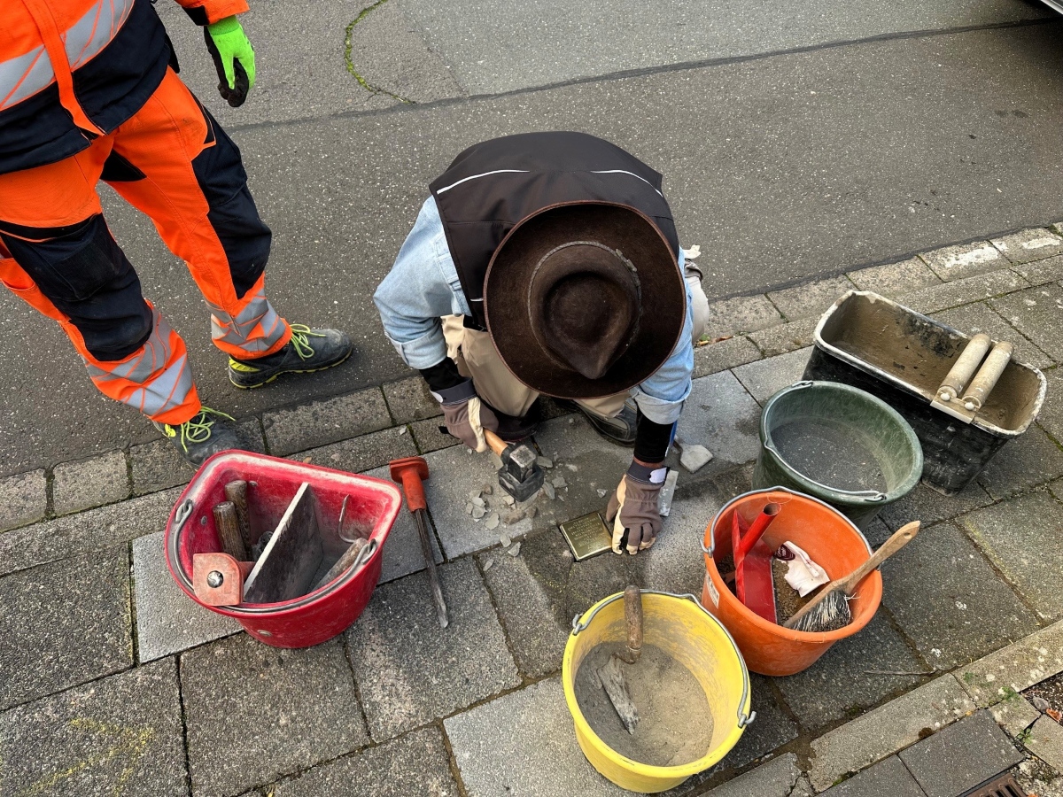 Der Dank des Bürgermeisters galt ferner Thomas Mörsdorf, dem Leiter des städtischen Fachbereichs für Kultur und Sport, sowie Markus Schröder, einem Mitarbeiter der Kommunalen Betriebe (KBR). Beide hatten gemeinsam just jene Stellen bestimmt, abgefahren und vorbereitet, die Demnig schließlich mit seinem Handwerkszeug ansteuerte.