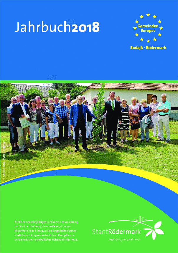 In Bodajk entstand das Titelbild des Jahrbuchs 2018. „Es war eine Selbstverständlichkeit, dass wir mit unseren ungarischen Freunden das zehnjährige Jubiläum der Verleihung der Stadtrechte gefeiert haben. Rund 70 Rödermärkerinnen und Rödermärker fuhren mit – erneut war es zu einem weit überwiegenden Teil eine reine Bürgerdelegation. Das ist sehr erfreulich!“, betont der Bürgermeister. „Rödermark ist eine Stadt, die sich in besonderer Weise dem europäischen Gedanken verpflichtet fühlt. Einen wichtigen Beitrag für unsere Verankerung in einem geeinten Europa leisten die engen Beziehungen, die wir mit unseren Partnerstädten Saalfelden, Tramin und Bodajk pflegen.“
