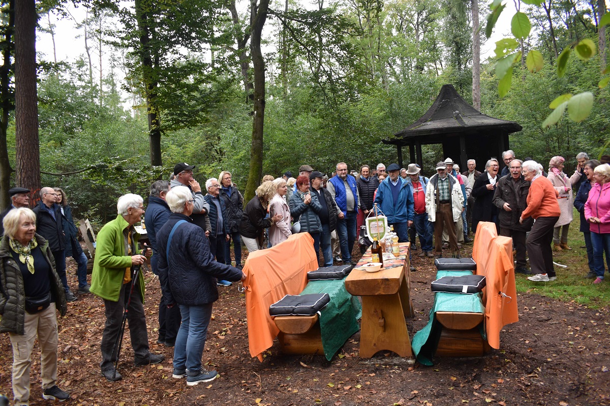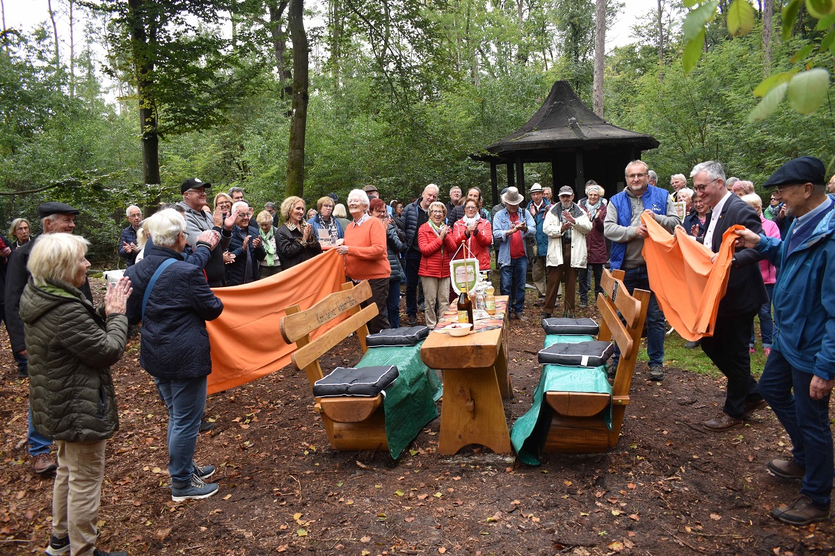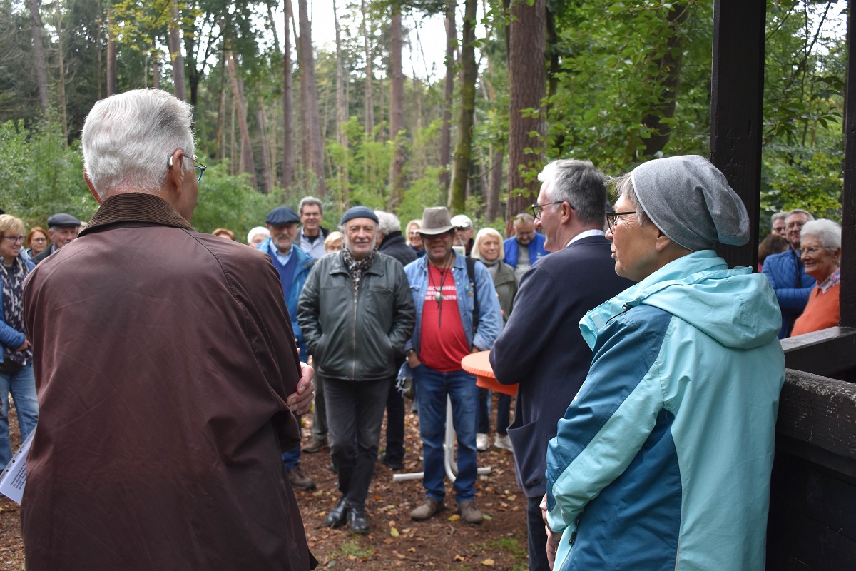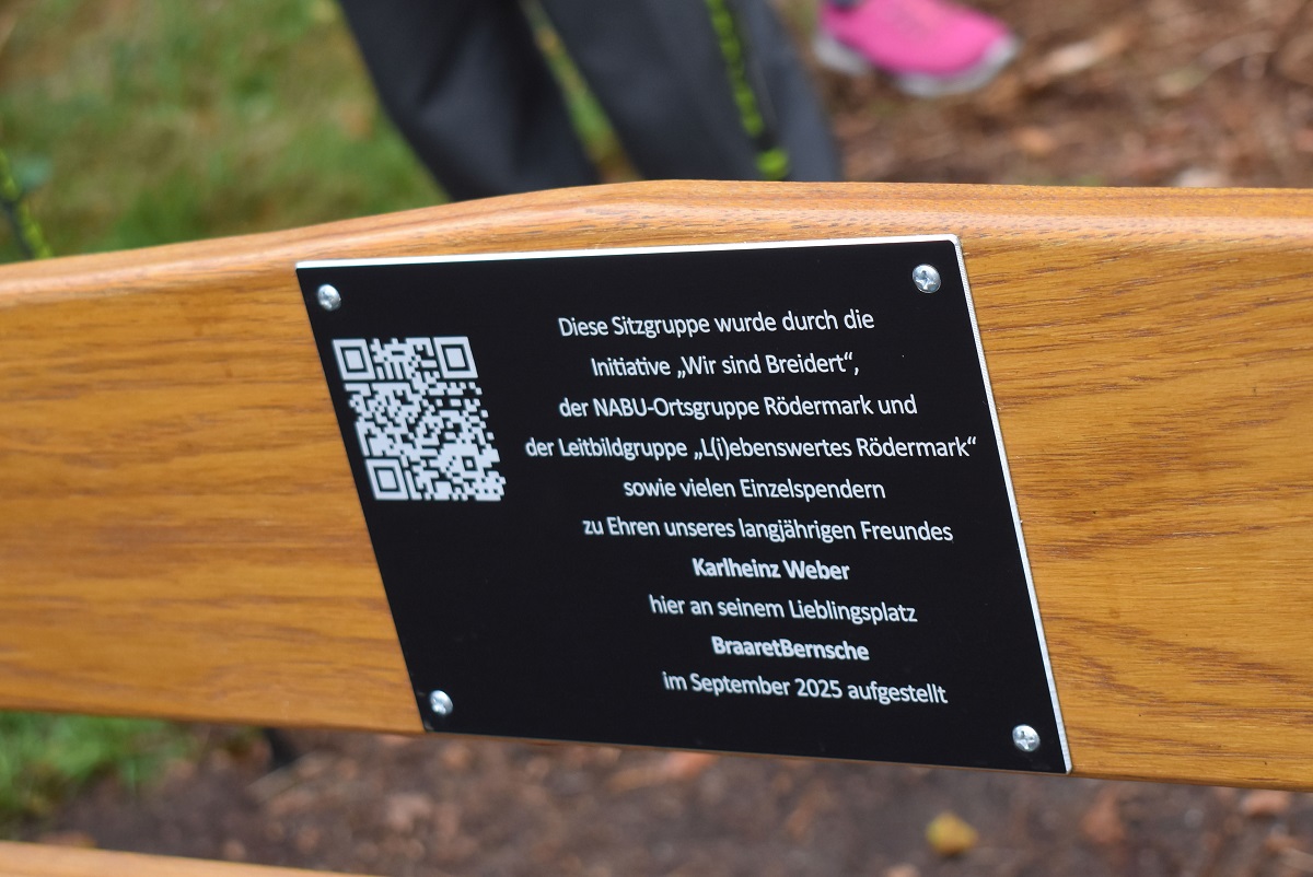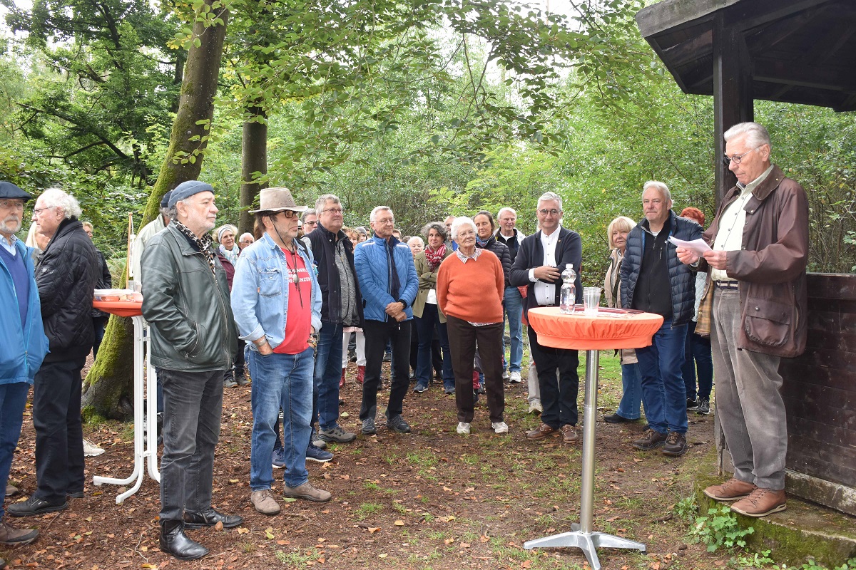Hintergrund der von sehr vielen Menschen besuchten Gedenkfeier war die von Rudolf Borek moderierte Enthüllung einer rustikalen Sitzgruppe aus dem Odenwald, die dank vieler Spender nun am einstigen Lieblingsplatz von Karlheinz Weber, direkt neben dem von ihm wieder mit ins Leben gerufene Braaret-Bernsche, zum Verweilen einlädt. Mit Hilfe des Nabu hat sie nun einen guten und soliden Platz gefunden, mit Widmungsplatte und mit einem QR-Code versehen, der auf die Hintergründe der Quartiersgruppe und vor allem auf Karlheinz Weber verweist. Im Namen der Familie bestätigte Thilo Weber, wie sehr seinem Vater wohl diese Idee und ihre Ausführung gefallen würde: ein Platz für gute Gemeinschaft mitten in seiner geliebten Natur.