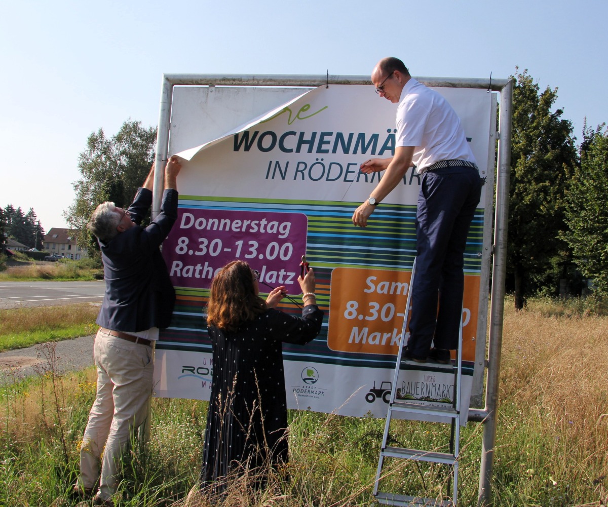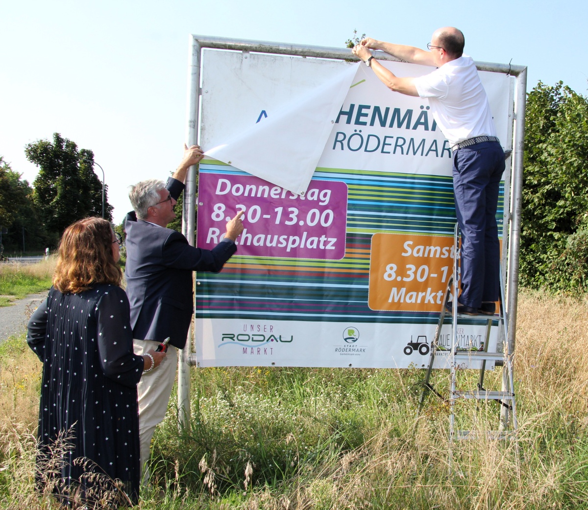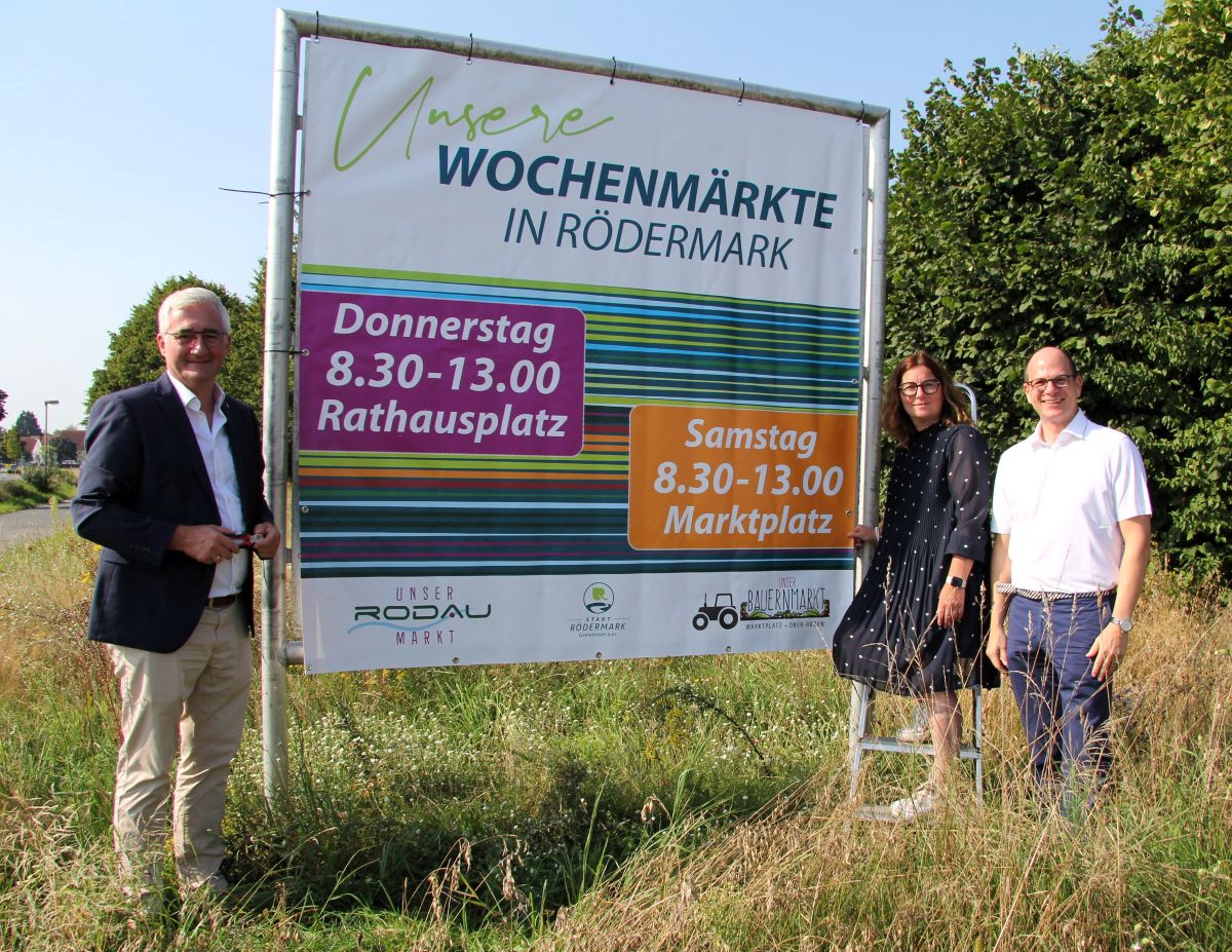 Mit poppigen Farben, prägnantem Design und der unmissverständlichen Botschaft, dass die Rödermärker Wochenmärkte weit mehr als nur einen Abstecher wert sind: So machen neue Banner in diversen Ortseingangsbereichen auf das Einkaufsvergnügen unter freiem Himmel aufmerksam. Bürgermeister Jörg Rotter, der Leiter der städtischen Wirtschaftsförderung, Till Andrießen, und seine Kollegin Beate Filbert haben die erste Werbefläche auf der dafür vorgesehenen Vorrichtung an der Frankfurter Straße in Höhe des Germania-Sportplatzes aufgespannt.