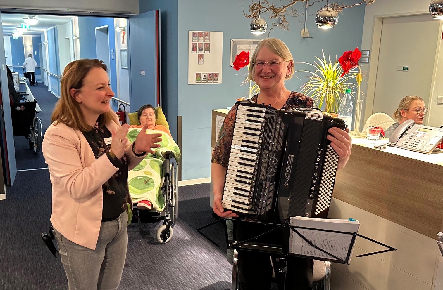 Foto 3: Ewa Zagorski (links), die im ArteCare Pflegestift „An der Rodau“ die Soziale Betreuung leitet, freut sich, wenn das Café Vergiss-Mein-Nicht in der Einrichtung gastiert und Musik erklingt.