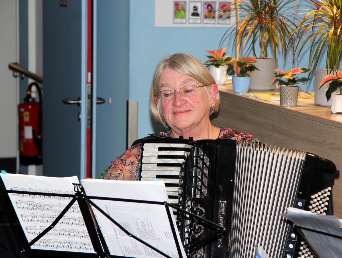 Foto 1: Momente zum Innehalten, behaglich-beseelt: So wie Gabriele Muhs, wenn sie mit dem Akkordeon musiziert, darf im Café Vergiss-Mein-Nicht auch das Publikum in Erinnerungen und Gedanken schwelgen.
