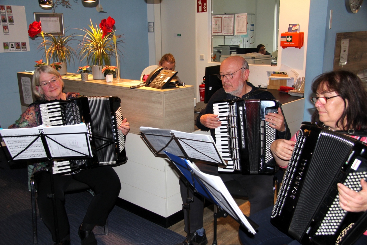 Foto 2: Gemeinsam mit Detlef Niedergesäß und Birgit Vay hat Gabriele Muhs im ArteCare Pflegestift „An der Rodau“ die Klangbrücke zur schönen blauen Donau geschlagen und anschließend Weihnachtsklassiker zu Gehör gebracht.