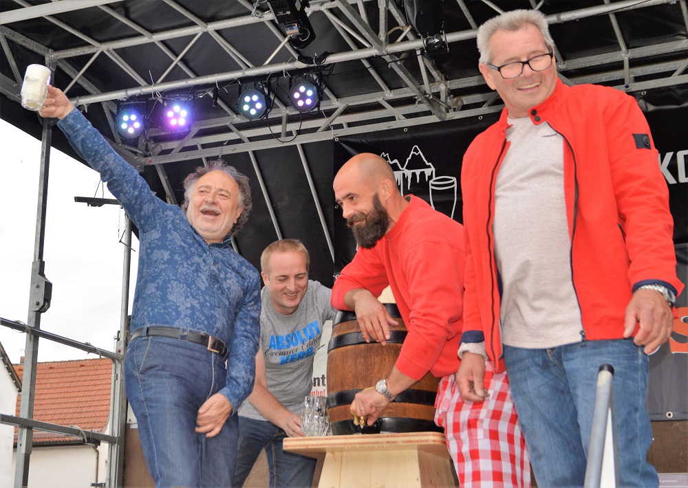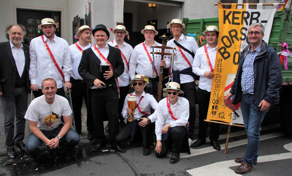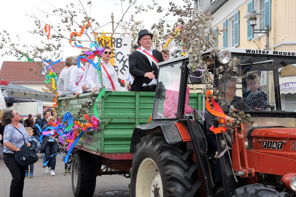 Am Nachmittag ließ sich das 9 Meter hohe Kerbbäumchen ganz mühelos von den Kerbburschen am Marktbrunnen in die Höhe ziehen und sichern. Dass es schon am Sonntagmorgen verschwunden war, ahnte da natürlich noch keiner. Gerüchten zufolge soll es gen Eppertshausen entschwunden sein. Seiner Kerbaufgabe wollte sich danach Bürgermeister Kern beim Bieranstich gewohnt routiniert entledigen. Doch trotz präziser Schläge mit dem Holzhammer ließ sich der Zapfhahn nicht befestigen und musste stets angedrückt werden, damit der Gerstensaft fließen konnte. Ausgerechnet bei seinem letzten Kerb-Bieranstich als Bürgermeister gab es für Kern bei dieser Aktion einen blauen Zeigefinger obendrein. Gute Gründe, den Samstagabend trotz des einsetzenden Regens gemeinsam mit vielen anderen auf der Kerb zu verbringen, lieferten die Band „Keyout“ auf dem Marktplatz, DJ Robby im Germania-Zelt oder der Bauwagen des Après-Ski-Komitees, und auch im Dinjerhof standen die Kerbgäste für Pfalzwein und Mispelchen an. Der vom Kreis verfügte Musikstopp ab Mitternacht war aber angesichts des ungemütlichen Wetters doch leichter einzuhalten als gedacht.