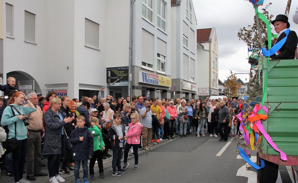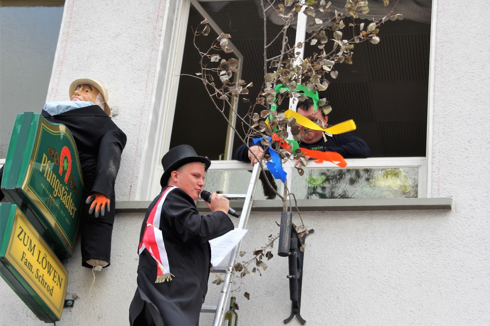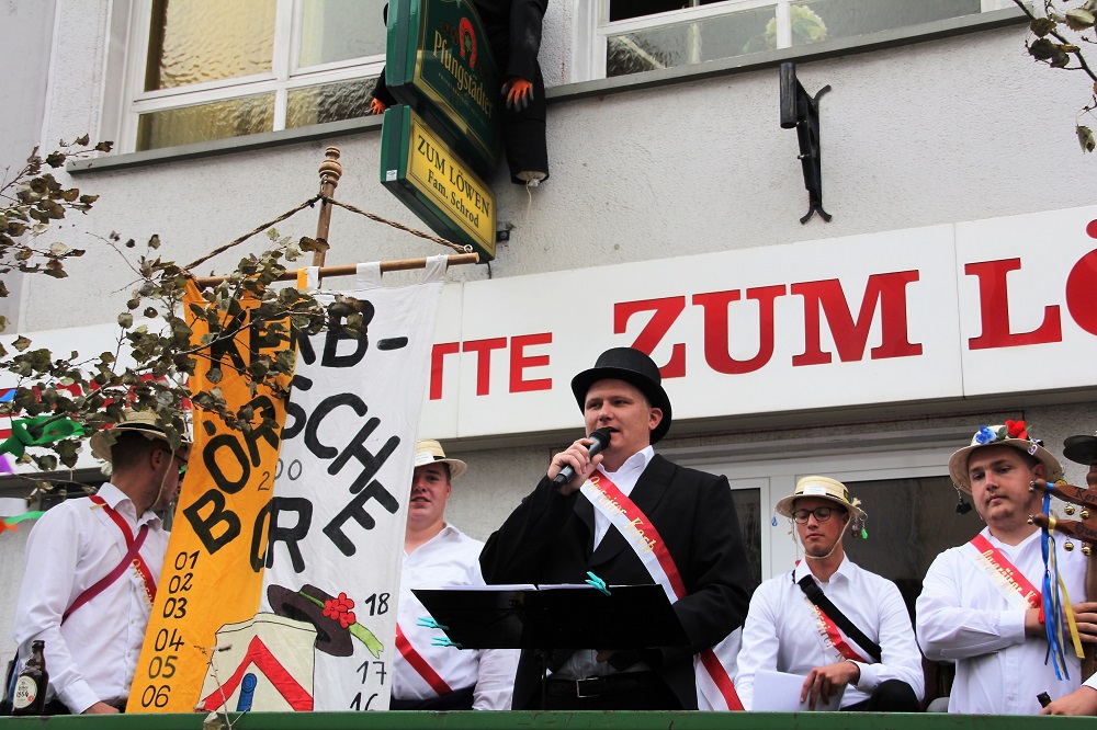 Immerhin hatte Petrus – oder wer auch immer für das Kerbwetter verantwortlich war – ein Einsehen mit einem der Höhepunkte: zum Kerbspruch, vorgetragen von Kerbvadder Florian Brehm, geschrieben von Norbert Köhler und Daniel Fenner, lugte sogar noch einmal die Sonne aus den Wolken hervor. Trotz des aufkommenden Windes, der schon den späteren Orkan ankündigte, nahm sich Brehm zu Beginn die Zeit, eines Ober-Röder Originals zu gedenken: „Der Joe ist gestorben!“ Der Tod des „Ortskernindianers, Luftgitarrenspielers und früheren Einkaufswagenschiebers“ habe alle mit Trauer erfüllt. Spöttisch blickte Brehm danach vom Wagen „vorm Mortsche“ nur sporadisch gen Westen, auch wenn das Aus für die Orwischer Post natürlich kommentiert werden musste: „Es gibt in Orwisch eh kaaner, der en Brief schreiwe kann!“ Ansonsten richtete sich sein Augenmerk vor allem auf Begebenheiten und Auffälligkeiten im Ort (der Rodaumarkt mit seinen Weintrinkern, der „Terroranschlag“ mit einer „verschissen Winnel“ am Bahnhof, das dortige Toilettenhäuschen oder der Schrankenzwischenfall beim Rathaussturm). Noch so manches beleuchtete der Kerbvadder, ehe er den Kerbstrauß in die Fahnenhalterung der Traditionsgaststätte steckte.
