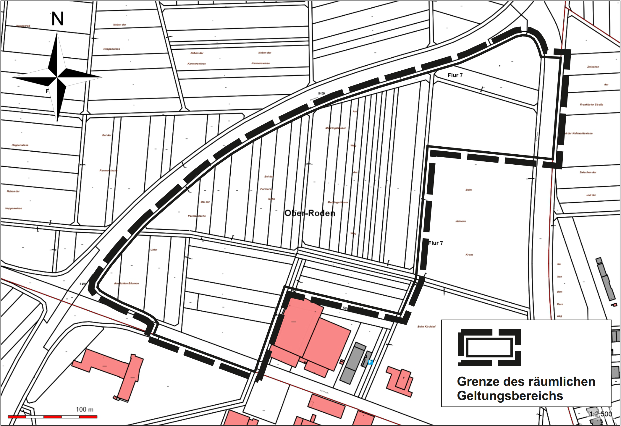 Der räumliche Geltungsbereich umfasst die Flurstücke Gemarkung Ober-Roden, Flur 7, Flurstücke 9, 10, 11, 107/3, 108/1, 109/2, 111/1, 112/1, 113/1, 114/1, 115/1, 116/1, 117, 118, 119, 120/1, 120/2, 121, 122, 123/1, 124/1, 126/1, 158/1 (tw.), 165/2, 166 (tw.), 182/3, 183/1, 193 (tw.), 198/ 2, 230/2, 246/1, 248/1, 249/4 (tw.), 250/2 (tw.), 251/1, 251/2, 252/1, 253, 254, 255, 256, 257, 258, 259, 260, 261, 262, 264, 265, 266/2, 275/1 (tw.), 276, 277 (tw.), 278 (tw.), 279 sowie 280 (tw.). Die genaue Abgrenzung kann der Abbildung entnommen werden, die man hier herunterladen kann.
