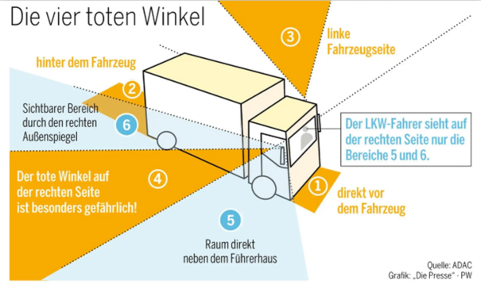 Es ist für jeden Lastwagenfahrer eine besonders heikle Situation: Das Abbiegen an einer Kreuzung in der Stadt. Bei großen Lastkraftwagen blickt der Fahrer aus ungefähr zwei Metern Höhe hinunter. Und trotz der Außenspiegel gibt es vier tote Winkel (vorn, hinten und seitlich neben dem Fahrzeug), die er nicht einsehen kann. Fußgänger und Radfahrer, aber sogar Autos verschwinden im toten Winkel oft komplett. Das kann zu schweren Unfällen führen.