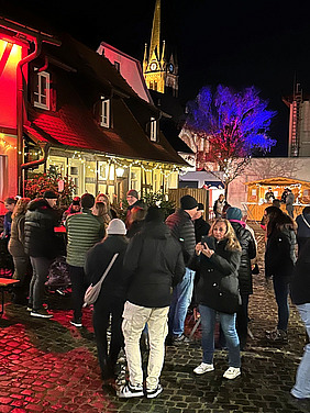 Nach der Einweihung herrschte Betrieb auf der kleinen Bummelzone zwischen dem Kirchplatz und dem Dinjerhof an der Pfarrgasse, wo der dortige Freundeskreis die organisatorischen Fäden zog. Mit den beiden Fixpunkten als Podium für Ausschank, Bewirtung (sehr vereinsverbunden: am Stand der TG Ober-Roden wurde mit grün-weißen Mützen gezapft und gegrillt), musikalischen Programmpunkten sowie dekorativer Vielfalt an den Ständen und im Forum St. Nazarius, wo auch in diesem Jahr der Kreativmarkt der Kolpingsfamilie seinen Platz hatte: So konnte der Adventsmarkt 2025 beim Publikum punkten.