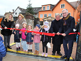 Gemeinsam mit Bürgermeister Jörg Rotter und Pfarrer Klaus Gaebler durchschnitten Kinder der Kita St. Nazarius das rote Eröffnungsband. Anschließend wurde gesungen, es gab Segensworte und viel Lob von den Anwesenden für das Areal, das mit historischer Mauersubstanz, Anpflanzungen und Sitzgelegenheiten eine Doppelfunktion erfüllt: lebendiger Treffpunkt bei größeren Veranstaltungen und ruhiger Rückzugsort im Alltag. Dabei gilt für beide Formen der Nutzung die Vorgabe „Mehr Aufenthaltsqualität in zentraler Lage“.