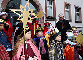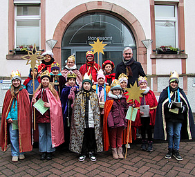 Zur Auflage des Jahres 2026 empfing der Verwaltungschef die von Koordinatorin Jana Hitzel und einigen Eltern begleitete Gruppe der Dreikönigs-Botschafter. Die hatten alles dabei, was bei diesem Jahresauftaktritual dazugehört: Weihrauchduft, Gesang und die obligatorische Geldsammelbox, die natürlich auch von Rotter mit einer Spende bedacht wurde.