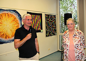 Zum anderen, so der Bürgermeister, sei der Brückenschlag erfreulich. Mit Maria Aßmann zeige eine Rodgauerin ausgewählte Kostproben ihres handwerklich-kreativen Könnens in Rödermark. Ihre wunderbar harmonisch ausbalancierte Farb- und Formensprache könne auf diesem kurzen Weg noch breitere Kreise ziehen und hoffentlich weitere Liebhaber und Käufer gewinnen, betonte Rotter beim Rundgang von Werk zu Werk.