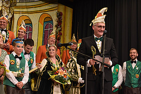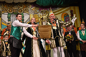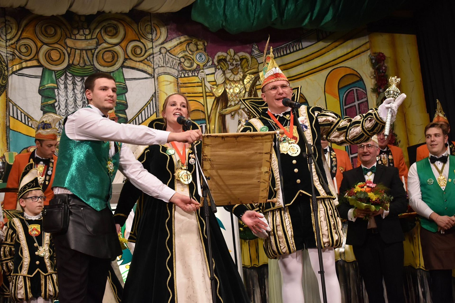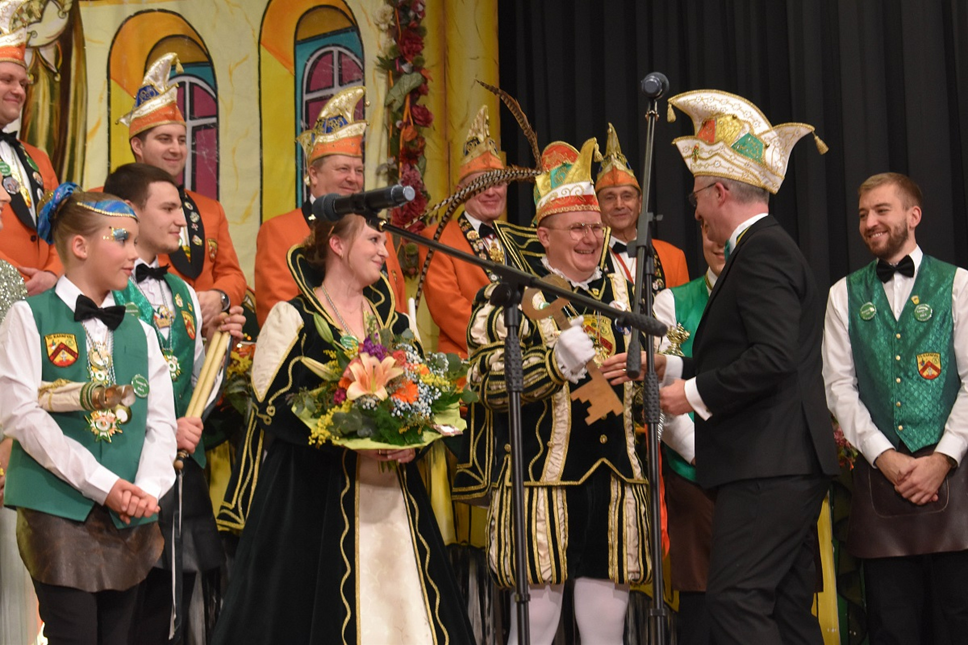 Zur Premierensitzung der Turngemeinde Ober-Roden gilt es auch für einen Bürgermeister, den wahren Machthabern während der fünften Jahreszeit zu huldigen. Mehr als das: Vor geballter Fröhlichkeit kapitulierte Stadtoberhaupt Jörg Rotter am vergangenen Samstag und übergab dem gerade inthronisierten Regentenpaar Prinz Florian I. und Prinzessin Leena II. den symbolischen Goldenen Stadtschlüssel. Was auffiel: Rotters Widerstandskraft war nur schwach ausgeprägt. Fast schien er sich zu freuen, die Last der Verantwortung abgeben zu können. Und das kurz nach seiner Wiederwahl. Ist jetzt auch schon der Rathauschef ins Narrenlager übergewechselt? Schließlich ist er selbst ein alter Fassenachter und gestandenes Hofgarden-Mitglied.