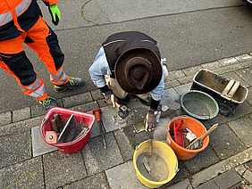 Foto 3: Gunter Demnig bei seinen Arbeiten an der Karlstraße in Urberach.