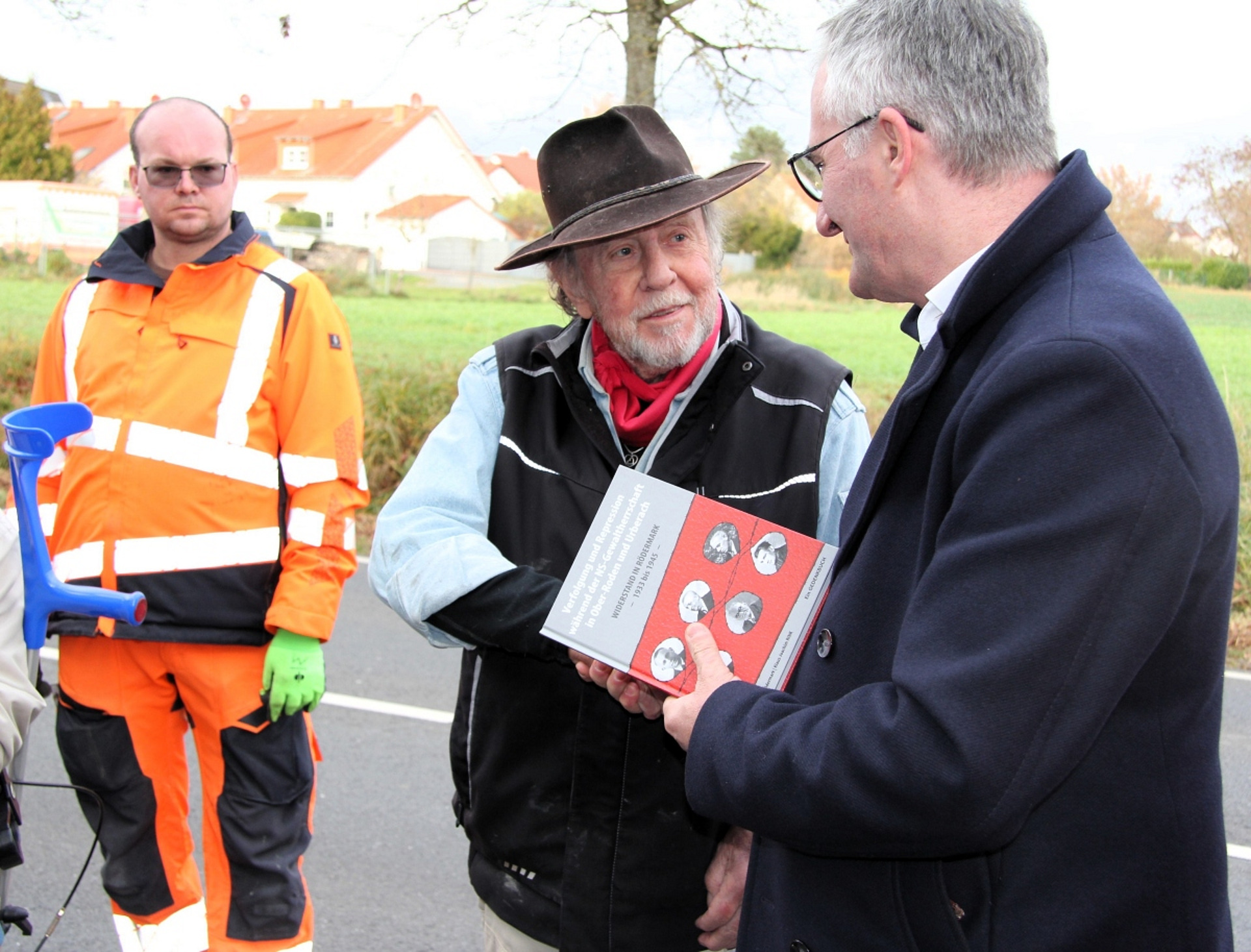 Foto 2: Bürgermeister Jörg Rotter überreichte Gunter Demnig ein Exemplar des Gedenkbuches, das 2022 herausgegeben wurde und die zentralen Begriffe Verfolgung, Repression und Widerstand im Hinblick auf die NS-Diktatur in Ober-Roden und Urberach beleuchtet.