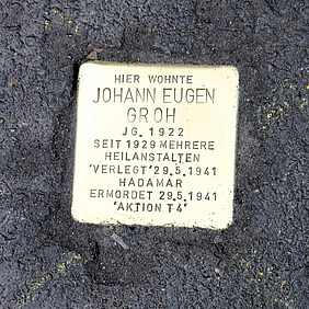 Foto: 4: An Johann Eugen Groh, der 1941 im Alter von 19 Jahren in Hadamar ermordet wurde, erinnert ein am Urberacher Ortsausgang Richtung Eppertshausen verlegter Stolperstein.