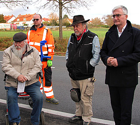 Foto 1, von links: Buchautor Klaus-Joachim Rink, Markus Schröder (KBR), der Künstler Gunter Demnig und Bürgermeister Jörg Rotter beim Start der jüngsten Stolperstein-Verlegearbeiten in Rödermark.