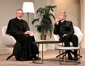 Foto: Noch lacht er… Doch schon bald gerät TV-Star Gerd Silberbauer (links) im Theaterstück „Kardinalfehler“ auf der kirchlichen Karriereleiter gehörig ins Straucheln.