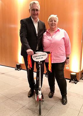 „Bürgermeister on tour“: Der kleine Tretroller, den Jörg Rotter von der Personalratsvorsitzenden der Stadtverwaltung, Birgit Geyer, im Foyer der Kulturhalle überreicht bekam, deutet symbolisch an, was hier wirklich Sache ist. Der Verwaltungschef will sich als Privatmann einen E-Scooter kaufen und damit seine mobilen Möglichkeiten im Stadtgebiet erweitern.