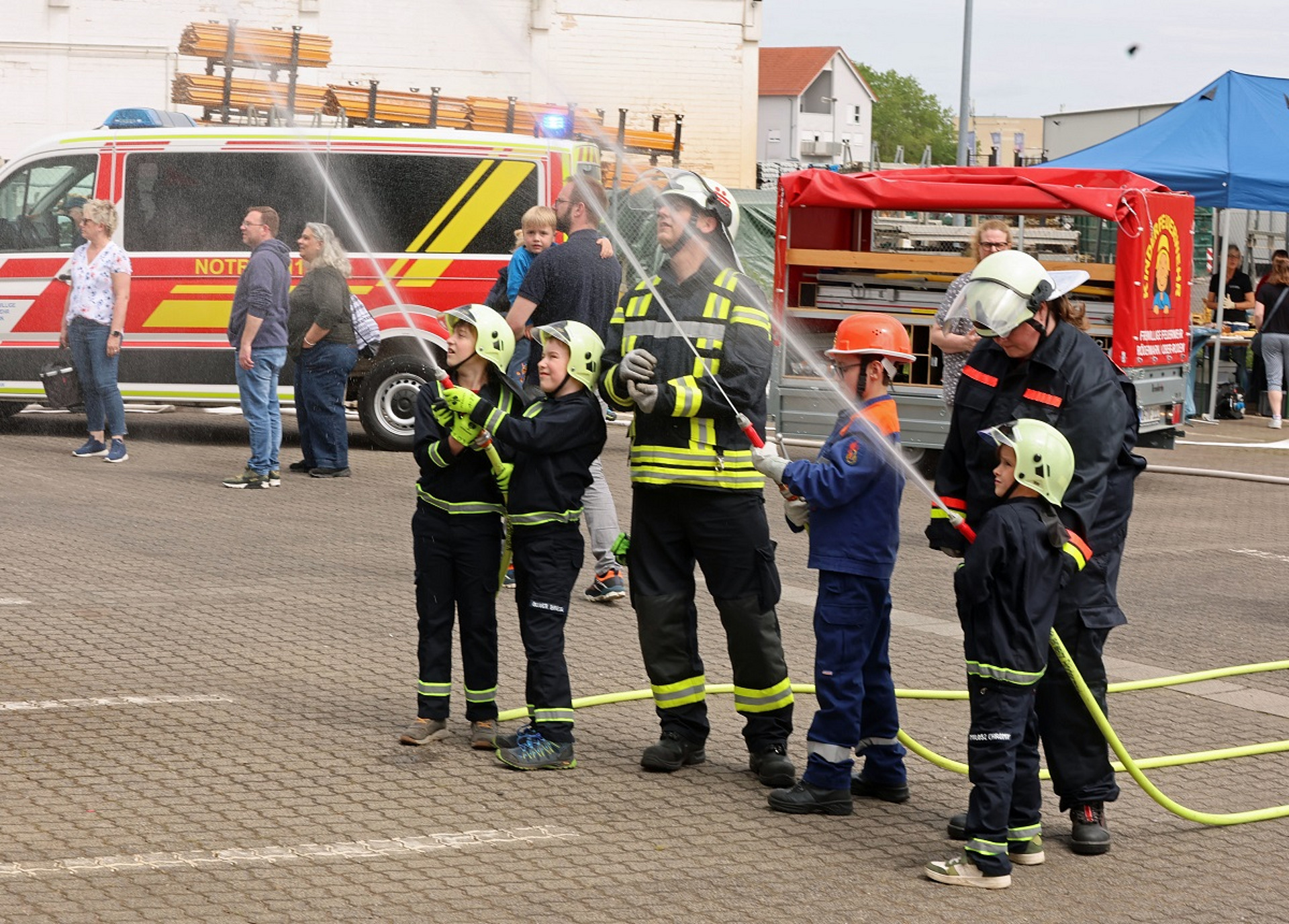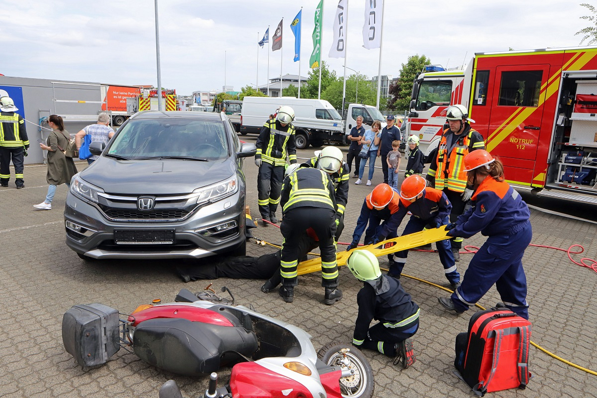 Schauplatz der Einsatzübung mit insgesamt 72 großen und kleinen Lösch- und Bergungsspezialisten war das Gelände der Firma Gundlach Nutzfahrzeuge an der Carl-Zeiss-Straße. „Wir sind dem Unternehmen sehr dankbar für die vielfältigen Möglichkeiten der Simulation, die wir dort großflächig nutzen konnten. Für uns war es die erste Aktion dieser Art seit sechs Jahren“, erläuterte Birgit Weber, die das Szenario der unterschiedlichen Herausforderungen gemeinsam mit ihrer Tochter Jenny erdacht und federführend koordiniert hatte.