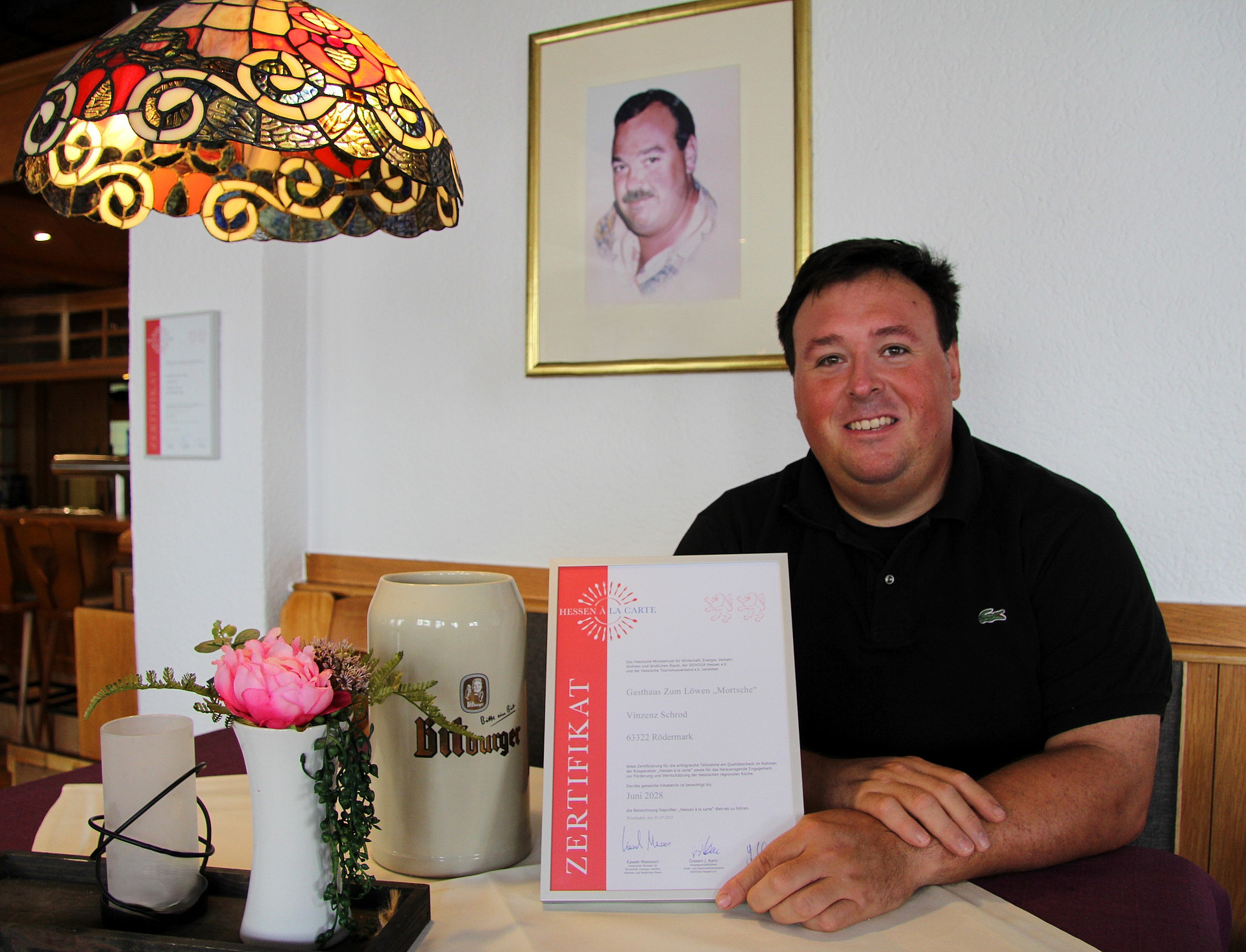 Fazit: Wer das Überlieferte hochhält in einer Zeit des forcierten Wandels, der viele Menschen zunehmend fordert und überfordert, hat zumindest ein Problem nicht. „Ich muss mich nicht jedes Jahr neu erfinden“, sagt Vinzenz Schrod lächelnd und präsentiert das Zertifikat von „Hessen à la carte“ vor einem Portrait seines verstorbenen Vaters Herrmann. Der wäre sicher stolz auf den Filius, wenn er noch mit am Tisch sitzen würde. Familienbande eben, weitergereicht und weitergeknüpft von Generation zu Generation – im Mortsche.