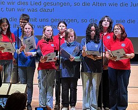 Foto 2: Die Europa-Songgruppe der Nell-Breuning-Schule unter der Leitung von Dr. Hanne Grünsteudel und Dr. Dietmar Herdt eröffnete die zweitägige Veranstaltung in der Kulturhalle mit einem musikalischen Beitrag.