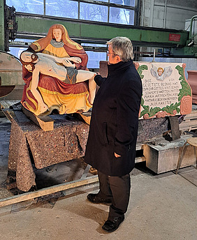 Die Steinplastik zeigt die populäre Dreier-Kombination: Maria mit dem Leichnam von Jesus Christus, dargestellt unter einem Kreuz. Jahrzehntelang fristete das Kunstwerk an der Durchgangsstraße im Ober-Röder Zentrum ein Mauerblümchen-Dasein. Doch nun ist ein Hingucker der besonderen Art geschaffen worden. In der Werkstatt von Restaurator Richard Löbig in Münster bei Dieburg, wo schon das Urberacher Pendant seine Frischzellenkur erhalten hatte, kam eine kleine Besucher-Delegation aus Rödermark kürzlich in den Genuss einer Vorab-Ansicht. Das einhellige Fazit auch diesmal, analog zur Aktion vor drei Jahren: „Es ist wunderschön geworden.“