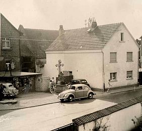 Fotos: Markante Gegenüberstellung von einst und jetzt. Die Pietà an der Ecke Frankfurter-/Mainzer Straße war in Ober-Roden über mehrere Jahrzehnte hinweg kein besonders markanter Blickfang. Doch das ändert sich nun alsbald. Pfarrer Klaus Gaebler (Foto) und andere Vorab-Betrachter zeigten sich in der Werkstatt von Restaurator Richard Löbig beeindruckt vom harmonischen Zusammenspiel von Form und Farbgebung. Auch die historische Aufnahme aus den Wirtschaftswunderjahren, die von Anwohner Marco Maxi zur Verfügung gestellt wurde, zeigt die Skulptur. Sie wurde seinerzeit von einem Kiosk flankiert.