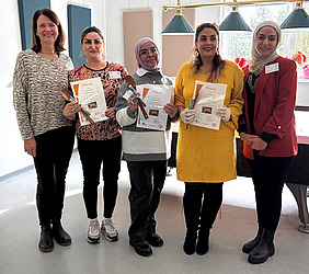 Foto 2: Die Prämierten, gekürt von den Gästen des Suppenfestivals, die Punkte für ihre jeweiligen Favoriten vergeben konnten. Von links nach rechts: Isabel Martiner, die Integrations- und Frauenbeauftragte der Stadtverwaltung, flankiert von Leila Rahimi (1. Platz in der Kategorie „Kreativste Suppe“), Nesreen Kabaha (1. Platz beim Thema „Beste Würzung“) und Firoza Noori (1. Platz in der Rubrik „Publikumsliebling“). Am rechten Bildrand: Latifa Al Awik, die ebenfalls zum rührigen Team der Rödermärker Integrationslotsinnen zählt.