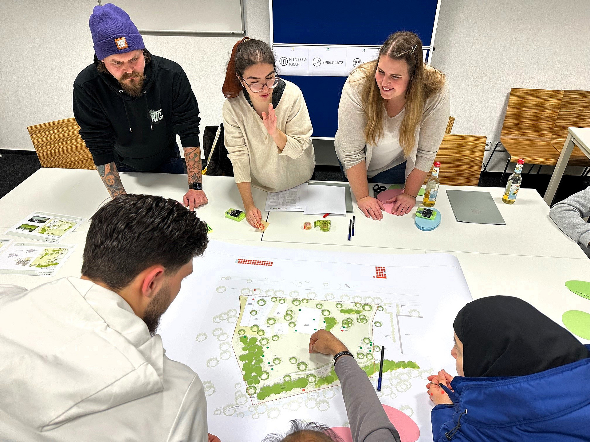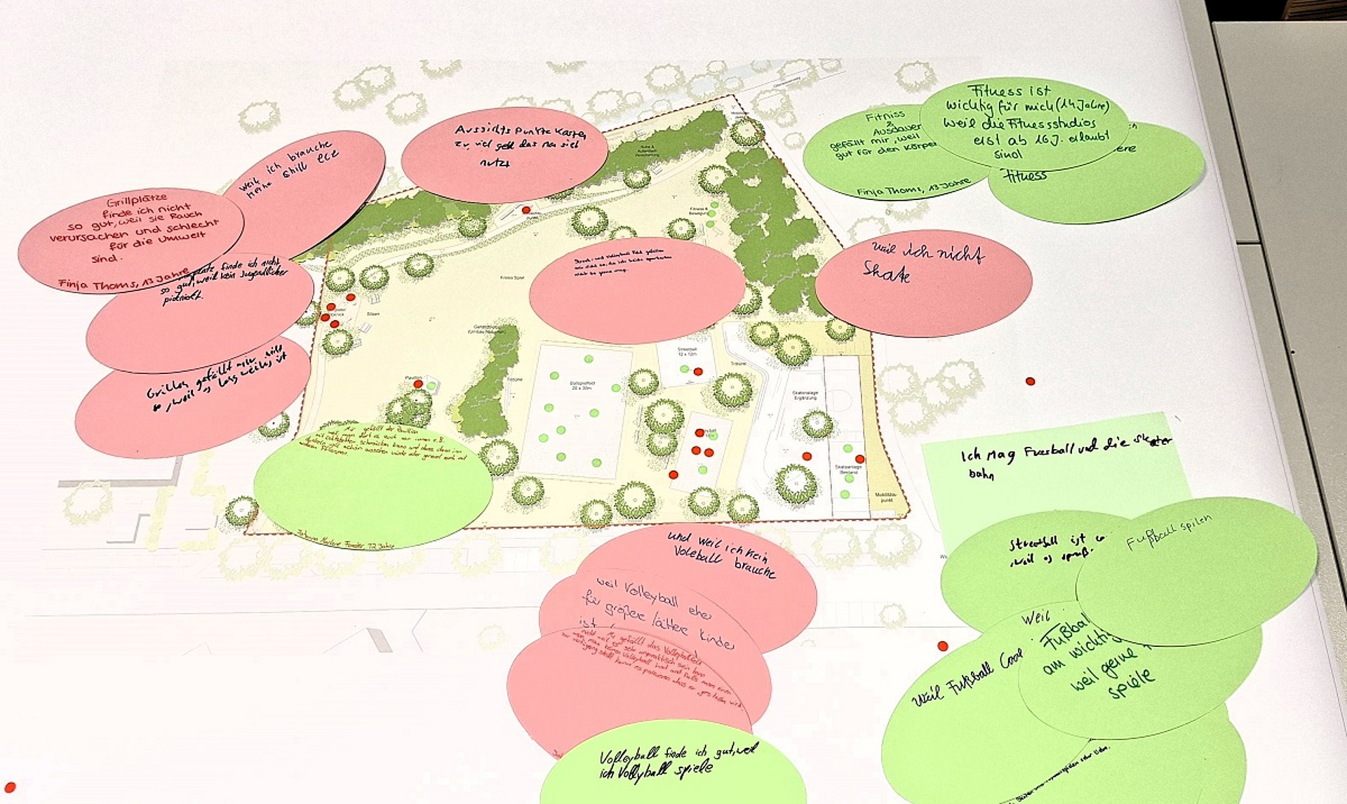 Apropos: Alle Beteiligten registrierten im Domizil der BA sehr wohl, wohin das Meinungspendel bei den Kindern, Jugendlichen und jungen Erwachsenen mehrheitlich ausschlägt. Noch mehr Roll- und Springspaß im Skater-Bereich wird befürwortet. Angedockt daran: Ein neuer Fitnessbereich, der in Sachen „Calisthenics“ und „Parkour“ einiges zu bieten hat, sowie Ballspielfelder, vornehmlich für die große Fraktion derjenigen, die gerne als Kicker und Korbjäger unterwegs sind. Für all diese angedachten Elemente im östlichen Bereich des Parks gab es viele Fürsprecher.