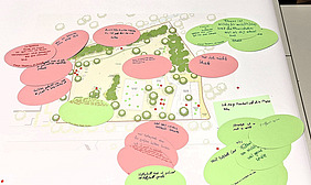 Kritisch gesehen oder gar – mit roten Klebepunkten – als entbehrlich eingestuft wurden hingegen Stichworte wie Aussichtspunkt und Picknickzone: Dinge, die in der westlichen Hälfte möglich wären, Richtung Badehaus, das ein Stück seines Außengeländes für den Spielpark 2.0 abgeben soll.
