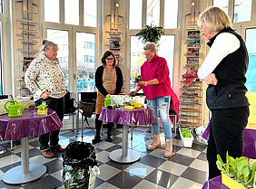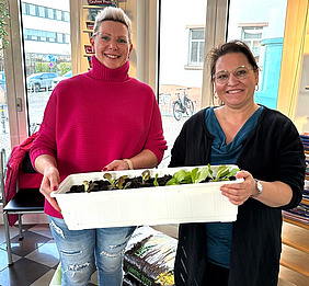 „Die Köpfe werden bis zu 20 Zentimeter hoch. Immer schön knackig frisch abernten, also oben etwas abschneiden. Das kann man eine ganze Zeit lang so machen“, erläutert Kerstin Kunze im Lesecafé des Rödermärker Bücherturms – und einige interessierte Frauen, die sich zu dem kleinen Pflanzseminar eingefunden haben und eifrig ihre Kästen bestücken, hören aufmerksam zu.