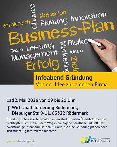Wirtschaft und Gründung Sprechstunde der Wirtschaftsförderung für Newcomer im Mai Mi. | 06.05.26 | 14:00 Uhr Sie möchten in Rödermark ein Gewerbe anmelden oder freiberuflich starten und wissen nicht genau, welche Schritte notwendig… Wirtschaftsförderung Rödermark Weiterlesen Ticket buchen Wirtschaft und Gründung Individuelle Sprechstunde mit Schwerpunkt Finanzierung und Förderung Fr. | 08.05.26 | 10:00 Uhr In einem Zeitfenster von 45 Minuten können Sie sich über Ihre Fragen zur Themenwelt: Finanzierung, Förderung, Buchhaltung,… Wirtschaftsförderung Rödermark Weiterlesen Ticket buchen Wirtschaft und Gründung Infoabend Gründung - Von der Idee zum eigenen Unternehmen Di. | 12.05.26 | 19:00 Uhr Gründungsinteressierte erhalten einen strukturierten Überblick über die wichtigsten Schritte auf dem Weg in die eigene… Wirtschaftsförderung Rödermark Weiterlesen Ticket buchen Wirtschaft und Gründung Individuelle Sprechstunde mit Schwerpunkt Existenzgründung Fr. | 19.06.26 | 10:00 Uhr In einem Zeit Fenster von 45 Minuten können Sie sich über Ihre Fragen zum Thema Existenzgründung informieren. Diese… Wirtschaftsförderung Rödermark Weiterlesen Ticket buchen
